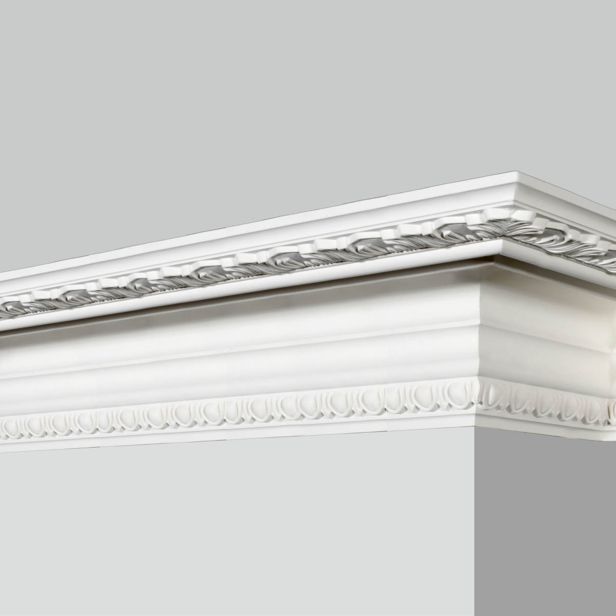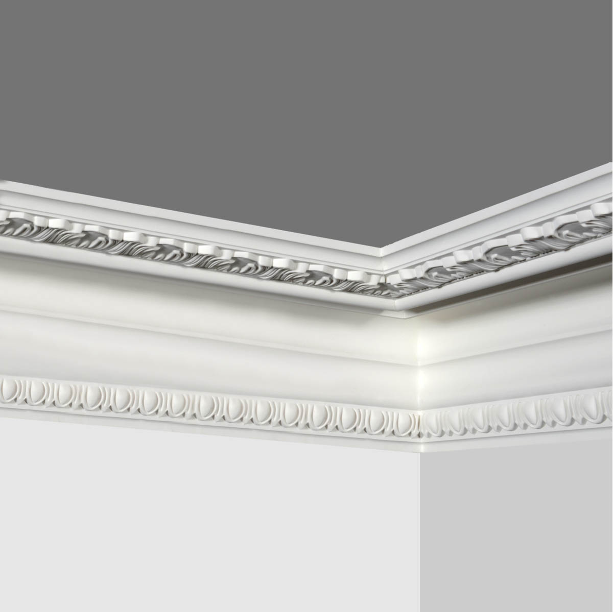 90 degree polyurethane decorative trim moulding, deep cove with no element attached and crafts elegant and graceful florals, eggs and darts on separated side making it extremely decorative. This series of Goodware molding refers to special patterns and specification, subjection to customization is attached.