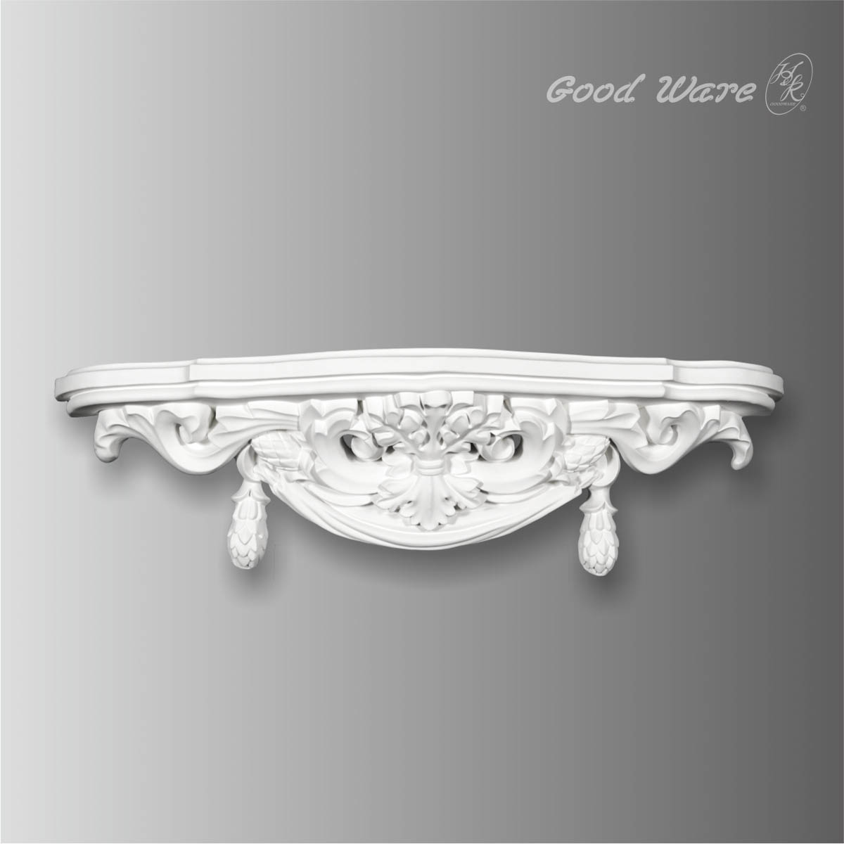 Baroque antique wall shelves for bedroom, 7-1/4”H X 29-3/16”W X 6-5/16”W in size. This wide wall shelve consists a flat platform for decorative ornament arrangement. The wall sconce comes with exquisitely and intricate crafted flowers and florals making it extremely attractive. It can be attached to wall to support flower, candle or other ornaments. All our Goodware moldings are pre-primed and customized.