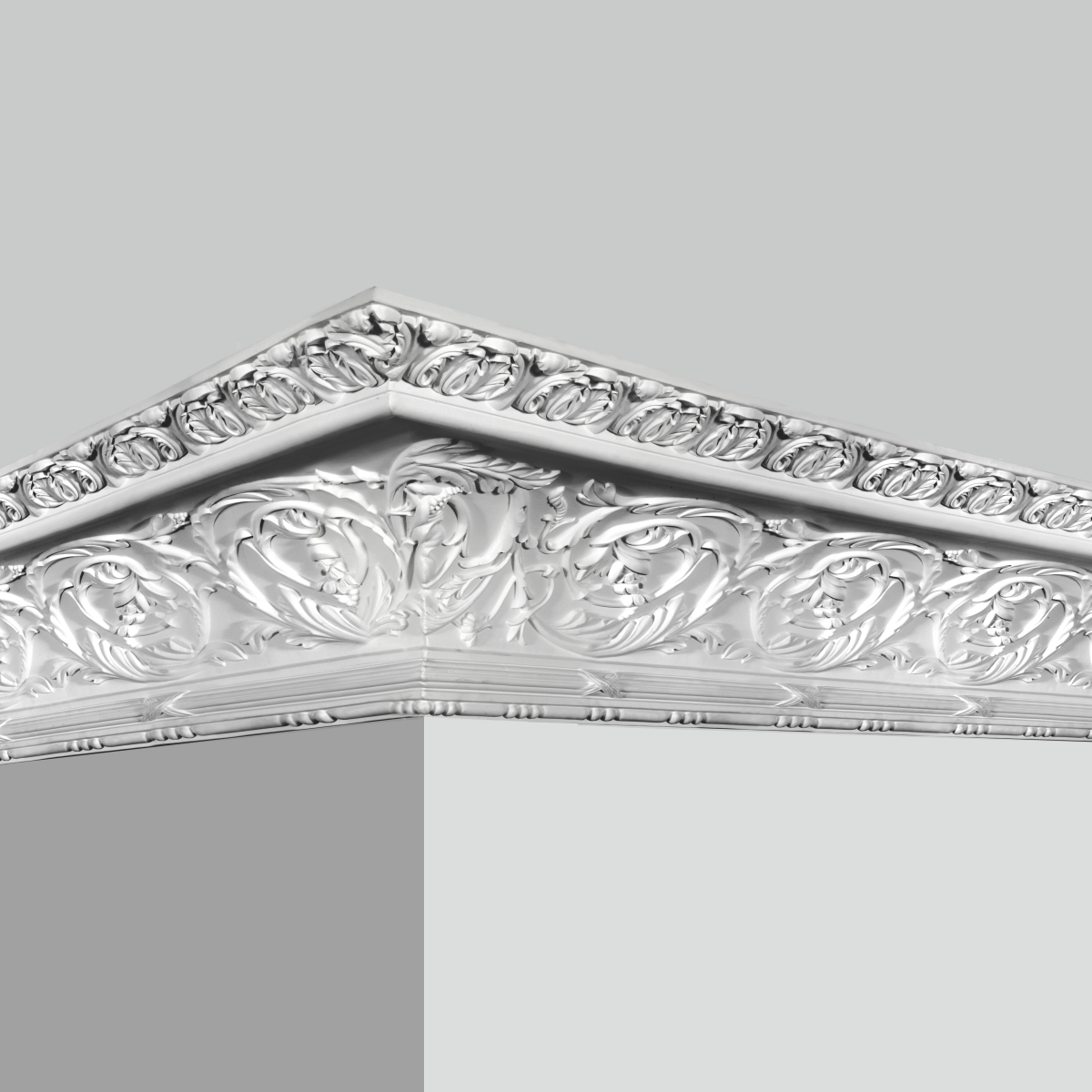 Polyurethane Baroque large cove moulding for sale is 12”H X 15-3/8”W X 94-1/2”L in size with a breadth 19-1/2”and flower:24”. This large scale baroque cove moulding utilizes a thin and gentle cove decorated with exquisite and splendid flowers making this molding dimensional and decorative. Our Goodware moldings are all open to customization.