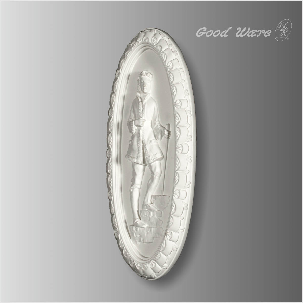 Polyurethane Baroque oval architectural wall plaques, 16-1/8”H X 7-3/4”W X 13/16”D in size. This oval architectural wall decoration applique crafts a gentleman staring up with a stick in vivid expression. The decorated crisp line enriches the mirror frame applique in great details. The round applique can be attached to walls, ceilings or frames to enhance the appearance. Our H&K Goodware wall decorations are open to be customized.