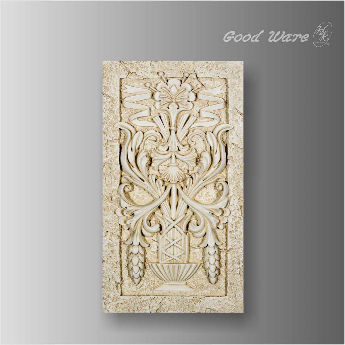 Polyurethane decorative Baroque indoor wall paneling for sale, 23-5/8”L X 13-3/8”W X 1-15/16”D in size. This fantastic faux stone relief wall panel is designed with elegant and coherent floral and flowers combined with corns in vivid details and expression. This wall panel demonstrates the fine craftsmanship and genius pursuit of quality. Relief wall panel can always create a new impression of walls, ceilings, due to the well compatibility with different styles of furniture, Our H&K Goodware relief wall panels are open to be customized.