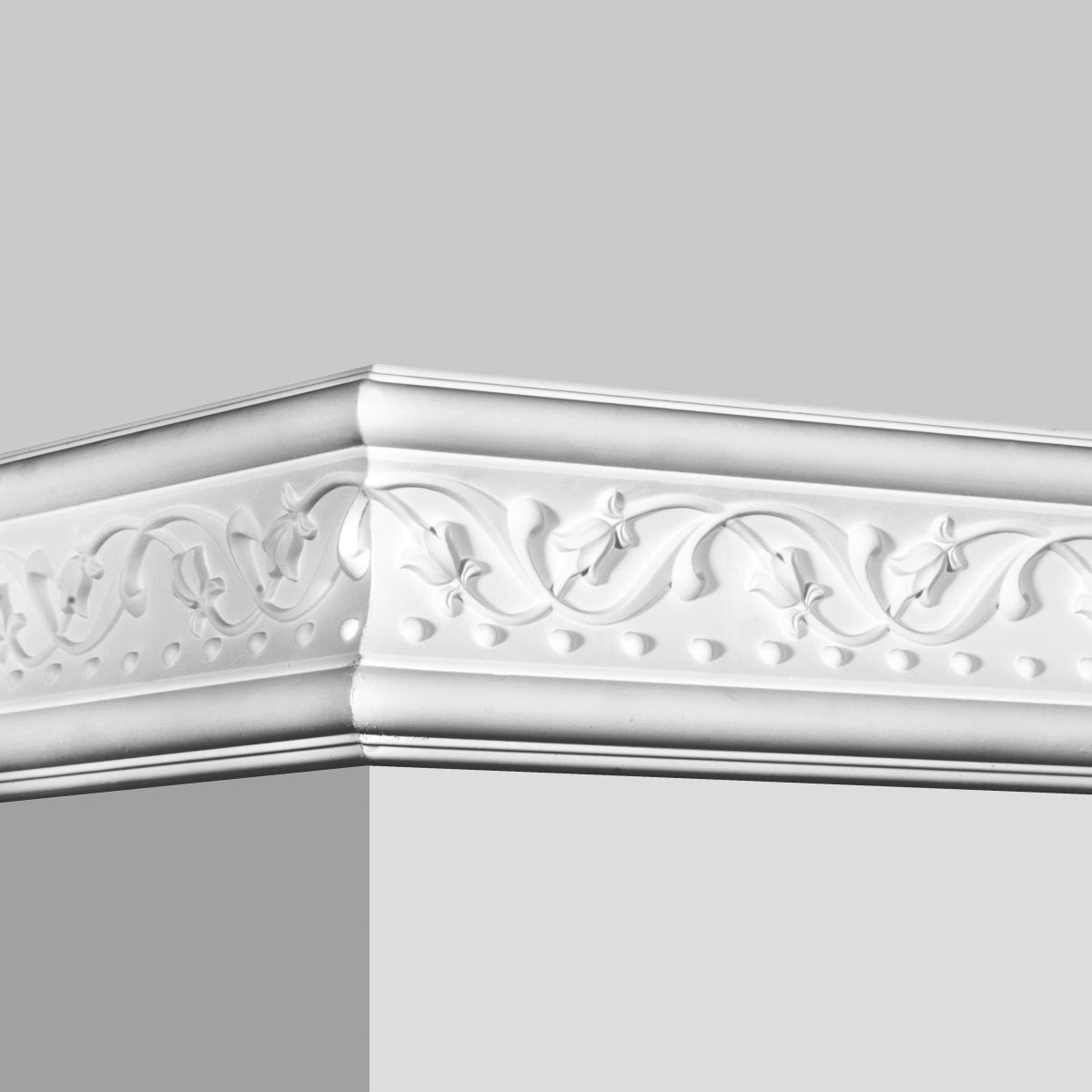 Decorative polyurethane white chair rail is 3-15/16”H X 7/8”W X 94-1/2”L with flower:4-1/8”. This decorative polyurethane white chair rail utilizes a typical cove placed with fleshing sprouts creating a scene of vitality. Our Goodware moldings are all open to customization.