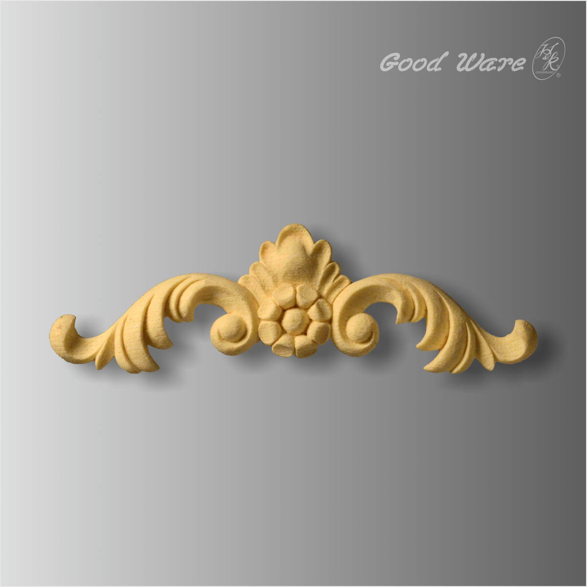 Faux wood architectural decor appliques, 3”H X 10-1/16”W X 9/16”D in size. This symmetrical artificial wood mimics the actual impression of wood in both grain and touch. The delicately hand-crafted flowers combined with fluent florals entitle it elegant touch making it extreme decorative. Our H&K Goodware imitation wood products are open to be customized.