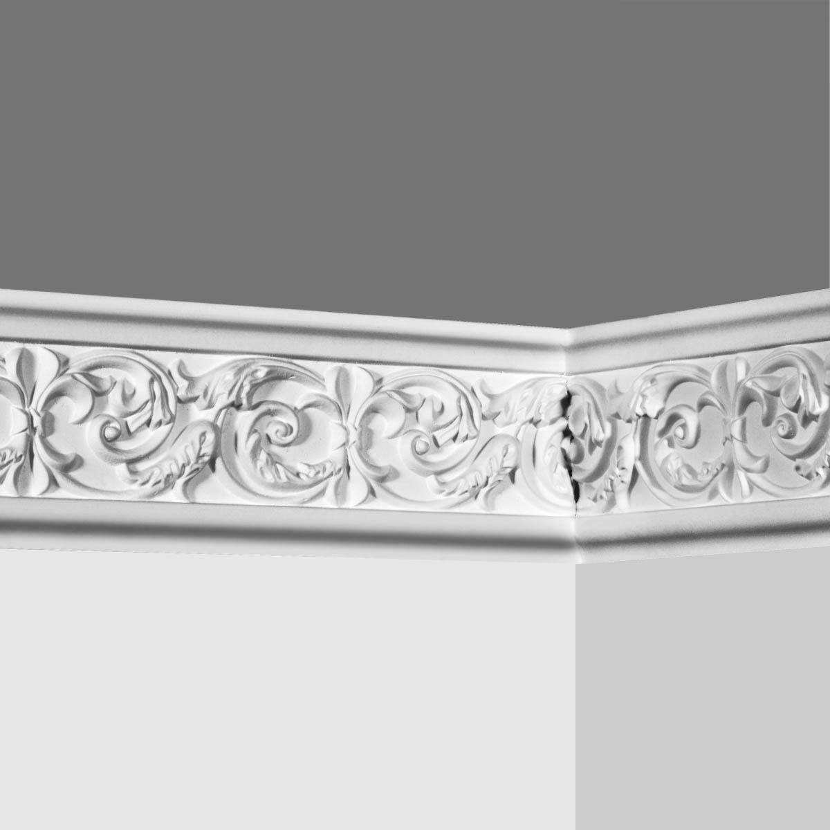 Polyurethane frieze commercial chair rail molding is 3-1/4”H X 9/16”W X 94-1/2”L with flower:4-7/16”. Our frieze commercial chair rail molding applies a classic molding figure carved within a flat carving cove forging some intertwined gracefull florals for commercial decoration purpose. Our Goodware molding can be a unique product customized by you.