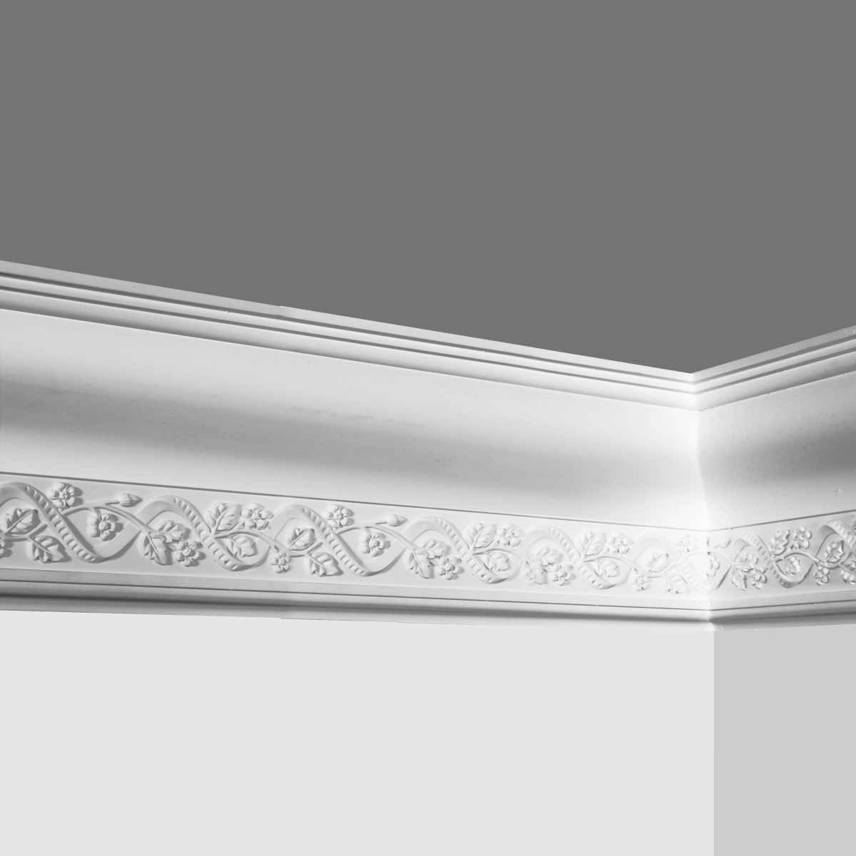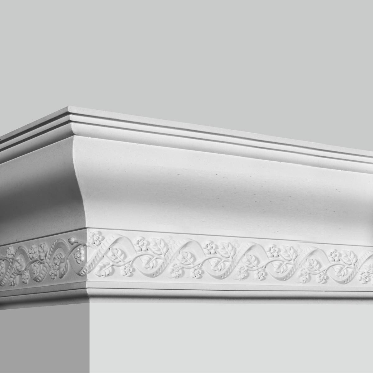 Large floral polyurethane crown moldings is 9-3/16”H X 3-15/16”W X 94-1/2”L in size with a breadth 10-1/16”and flower:8-11/16”. This floral polyurethane crown moldings introduces a waving cove and arranges steps and curl trim to give it more sense of layers. The exquisitely carved flowers at the bottom make this molding perfect for decorative application. Our Goodware moldings are all open to customization.