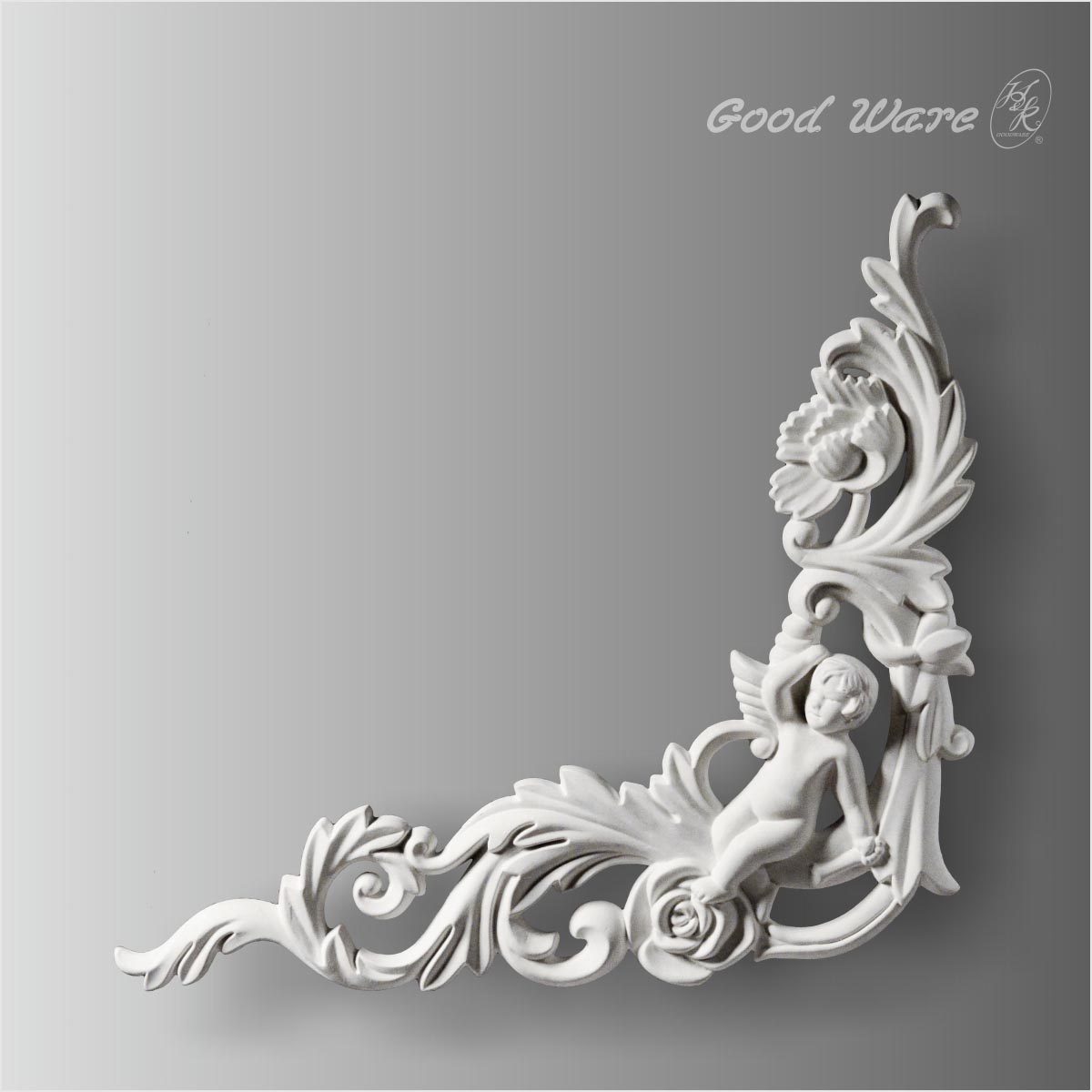 Large onlays corner for furniture, 9-5/16”H X 19-1/2”W X 1-1/16”D in size. places Cupid among the dense flowers in a reversed posture with model WC-8615. This applique crafts elegant florals and delicate flowers in stunning and gorgeous details. It can be applied to serve as doors or windows surrounds or decorate the roman pillars. Our H&K Goodware appliques and onlays products are open to be customized.