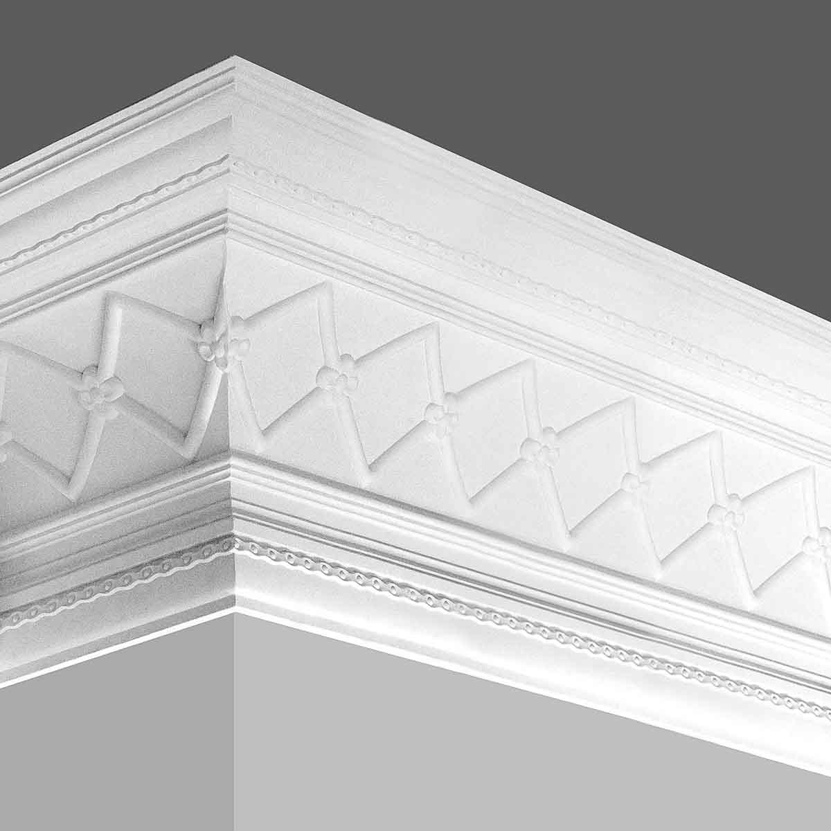 Large polyurethane antique crown molding for sale, a huge profile flat thin cove crafts weaving diamond figures creating gigantic smooth and clean surface for sharp relief. This series of Goodware molding refers to special patterns and specification,subjection to customization is attached.