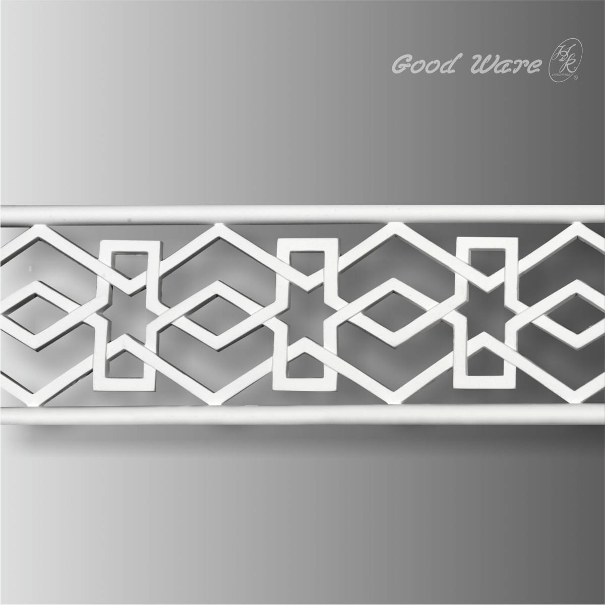 Pierced decorative house trim molding for sale, 4”H X 1/4”W X 94-1/2”L in size and with a Flower of 3-1/8”. This large pierced molding involves triple elements combining recessed rhomboids with squares forming an auspicious image. The wide range flowers and spacious hollow hole are pervious to light creating this molding highly decorative. All our Goodware moldings are pre-primed and customized.