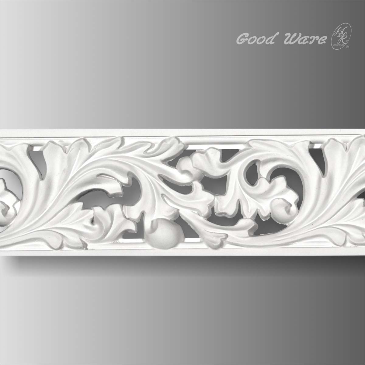 Pierced scroll acanthus white interior trim, 3-9/16”H X 5/8”W X 90-3/16”L in size and with a Flower of 7-1/2”. The medium pierced molding crafts complex and intricate florals in exquisite and elegant details. The dense arrangement of flowers makes this molding extremely decorative. All our Goodware moldings are pre-primed and customized.