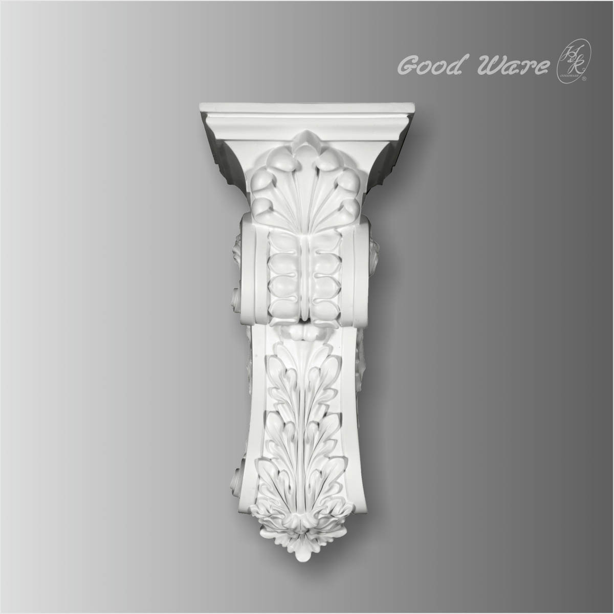 Polyurethane acanthus corbels for kitchen island, 18-5/16”H X 8-1/16”W X 8-11/16”D in size. As the medium model of WB-8102 this acanthus corbel displays the craftmanship in the same accuracy and precision but in different scale. This corbel can be put into the applications like entry, counters, shelves regardless of interior or exterior. Our H&K Goodware corbels are open to be customized.