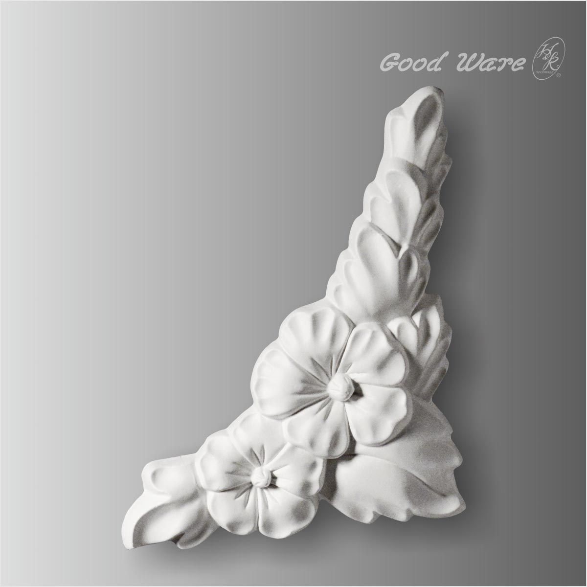 Polyurethane accents corner onlays, 7-1/2”H X 6-1/8”W X 1”D in size. The applique and onlays are solid urethane for maximum durability and details. The flower carving patterns of applique and onlays are very beautiful. It can be glued on the wall, doors, furniture, cabinets, cupboards, windows or mirrors and will make your room look stylish and classic. Our H&K Goodware applique and onlay products are open to be customized.