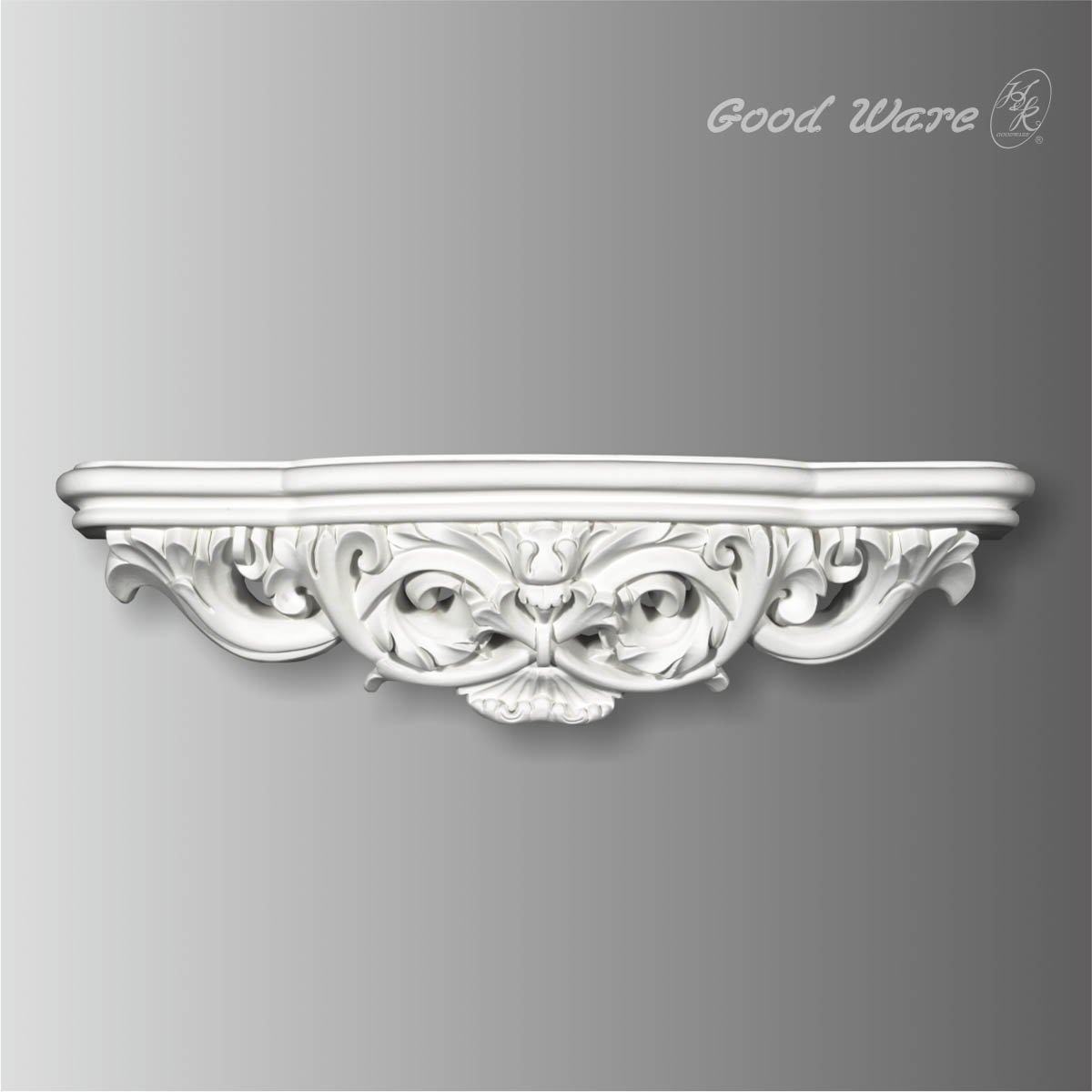 Polyurethane antique shelf brackets, 6-1/4”H X 25-3/16”W X 4-13/16”W in size. This wall shelve is truly unique in design and function. It combines elegantly and gorgeously carved florals and flowers with a functional platform for other ornament support. It will not rot or crack and is impervious to insect manifestations. All our Goodware moldings are pre-primed and customized.