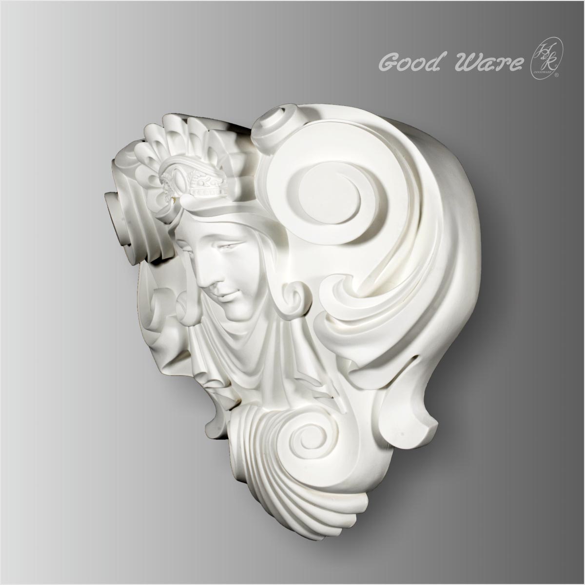 Polyurethane antique wall decor corbel for sale, 16-1/8”H X 16-15/16”W X 8-7/16”D in size. This dimensional architectural wall decoration is molded after historical design crafted with an elegant and graceful queen figure. This wall decoration can be used in combination with other architectural decorative elements to create graceful and stylish ambiance. Our H&K Goodware wall decorations are open to be customized.