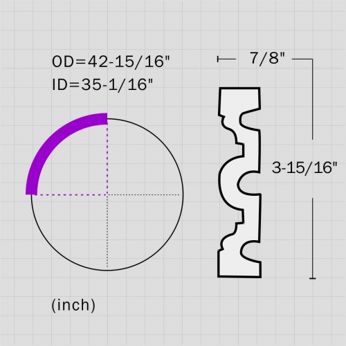 Polyurethane architectural rings design for ceiling, 3-3/16”H X 13/16”W in size with an 38-9/16” OD and 32-5/16” ID. This small size arc frame demonstrates dual protruding coves illuastrating strong snese of depth and dimension. The ceiling rail will serve as an ornamental device for dome or be jointed with HK-623 to decorate the ceiling or walls. All our Goodware moldings are pre-primed and customized.