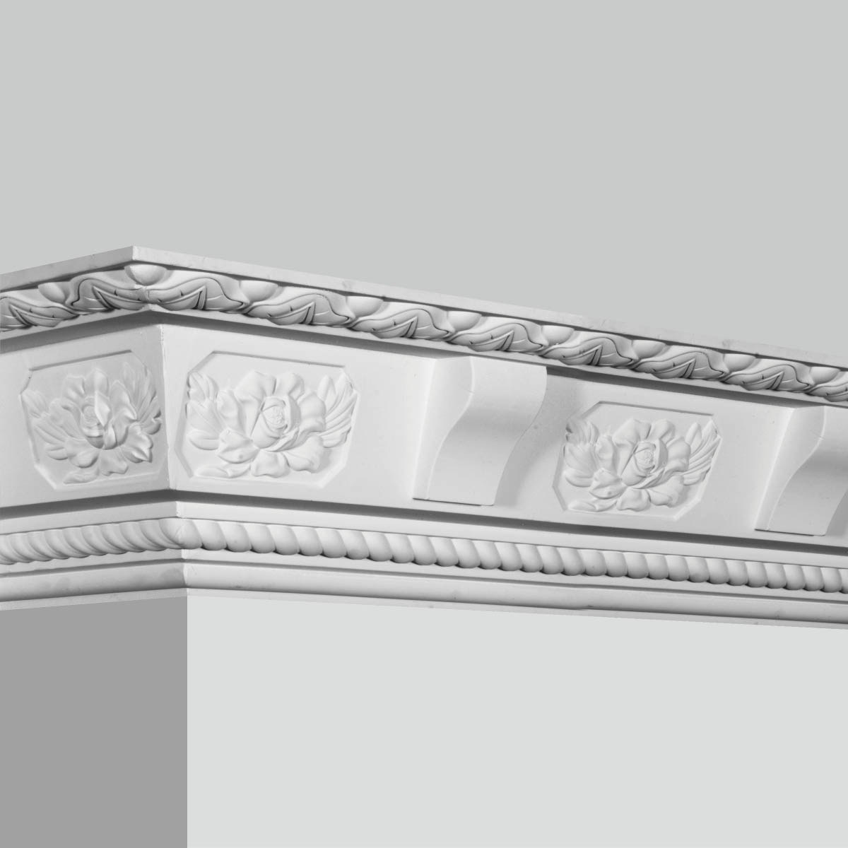 Polyurethane Baroque crown molding can be coped, mitered, cut and installed just like a wood product and arrives pre-primed white and ready for paint. The floral design gives you a unique and elegant look for your home.