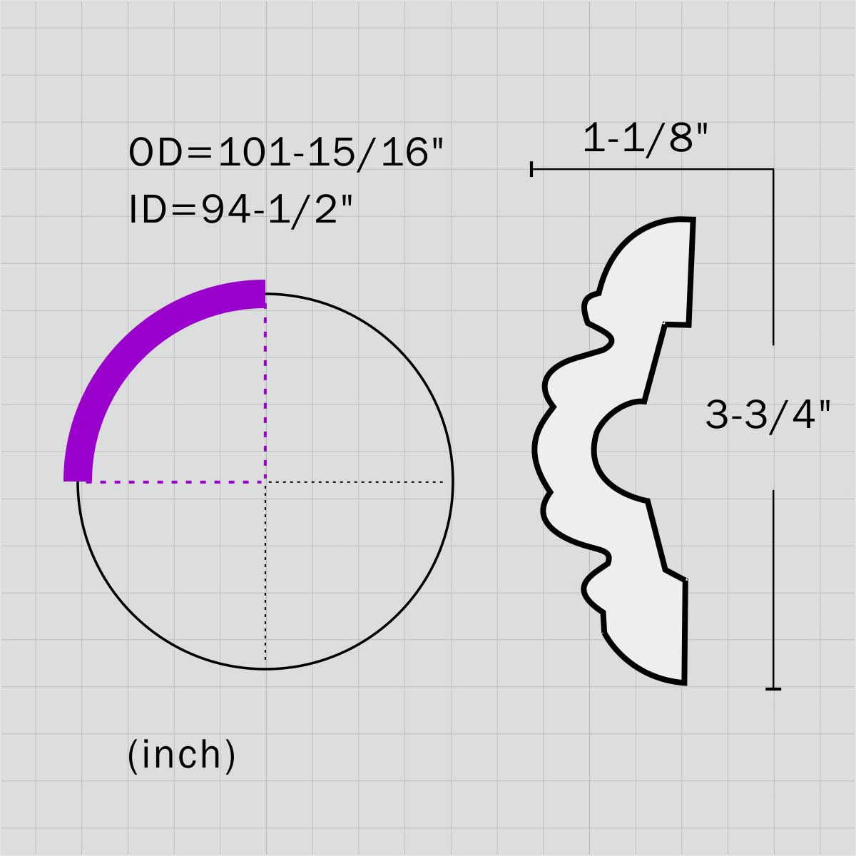 - OD:101-15/16”, ID:94-1/2”