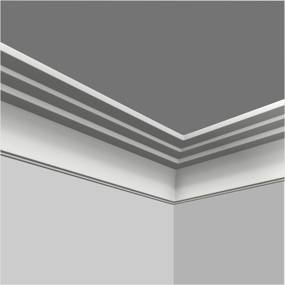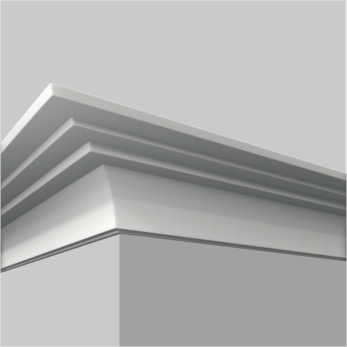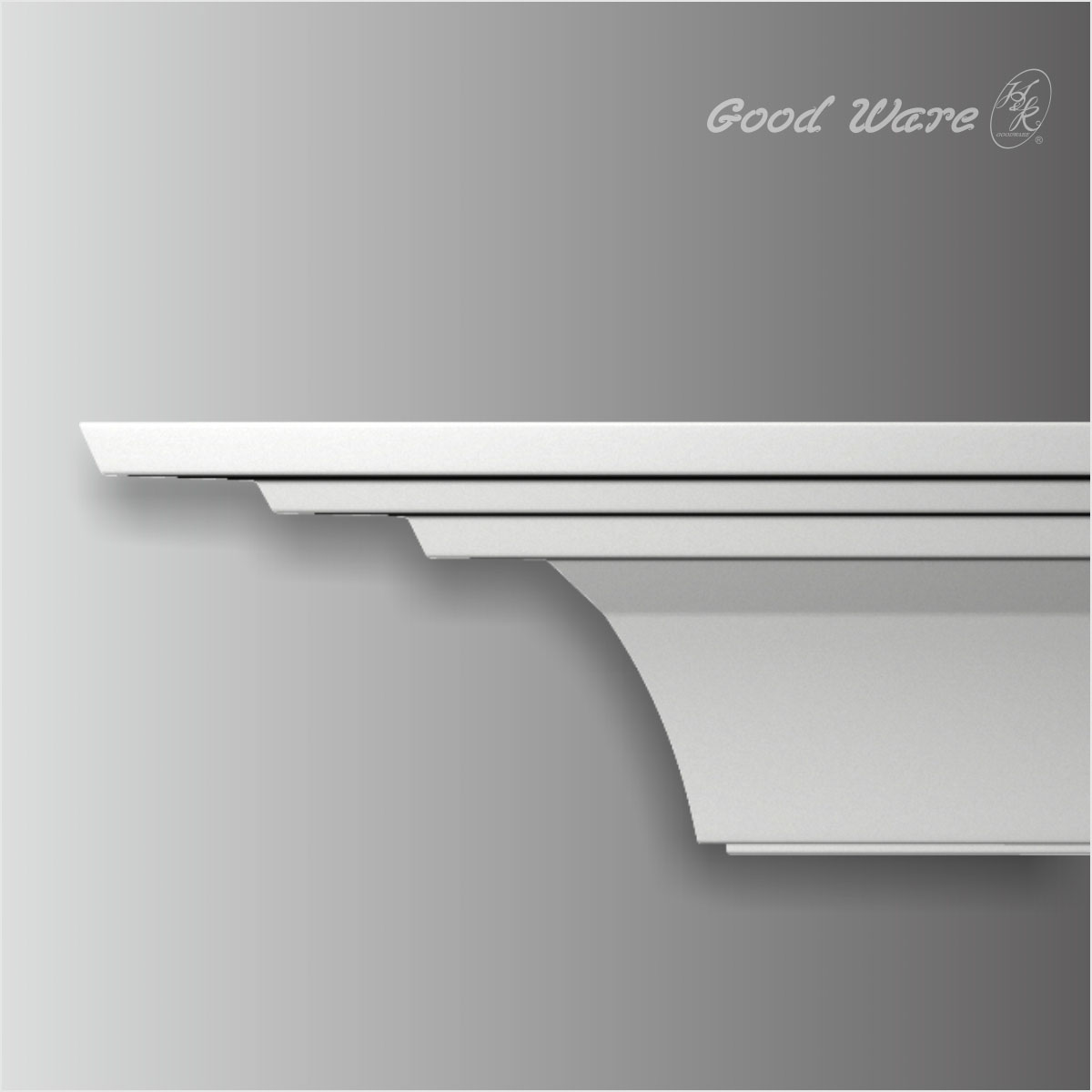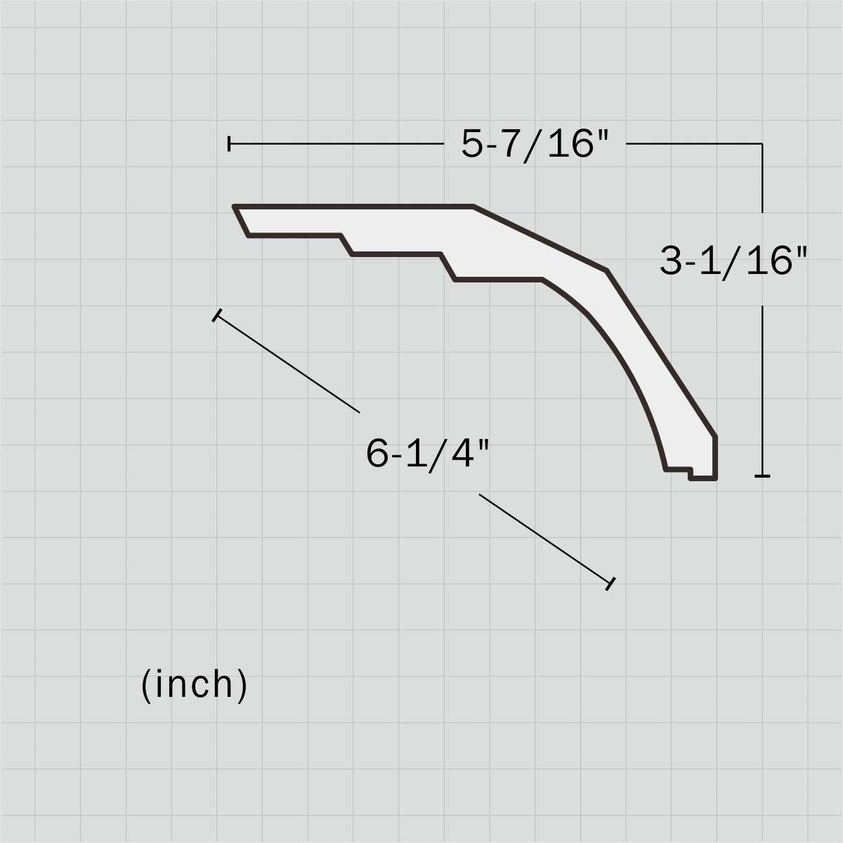 Polyurethane classic contemporary crown molding, 3-1/16”H X 5-7/16”W X 94-1/2”L in size and with a breadth of 6-1/4”. The small size plain molding adopts a dimensional expression method utilizing multiple steps and a cove below to form the sense of layers and dimension. All our Goodware moldings are pre-primed and customized.