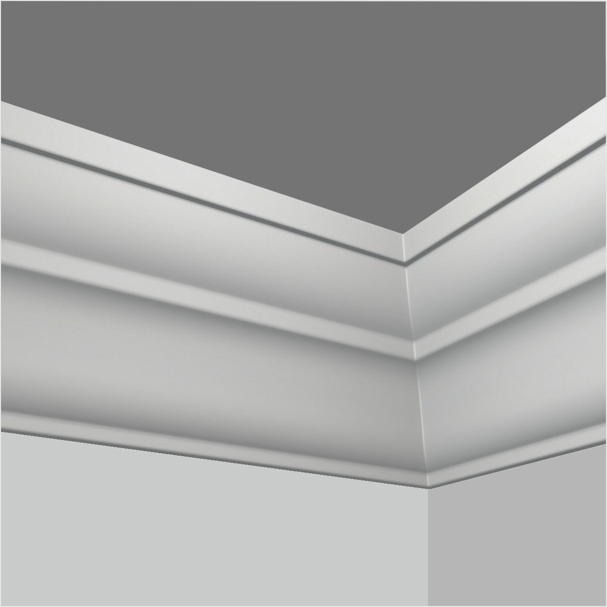 Polyurethane contemporary crown molding, 3-1/8”H X 5-1/4”W X 94-1/2”L in size and with a breadth of 6-11/16”. This large scale molding demonstrates a waving cove decorated with multiple trims on both sides creating a smooth and sleek surface designing to relieve sharp sense. All our Goodware moldings are pre-primed and customized.