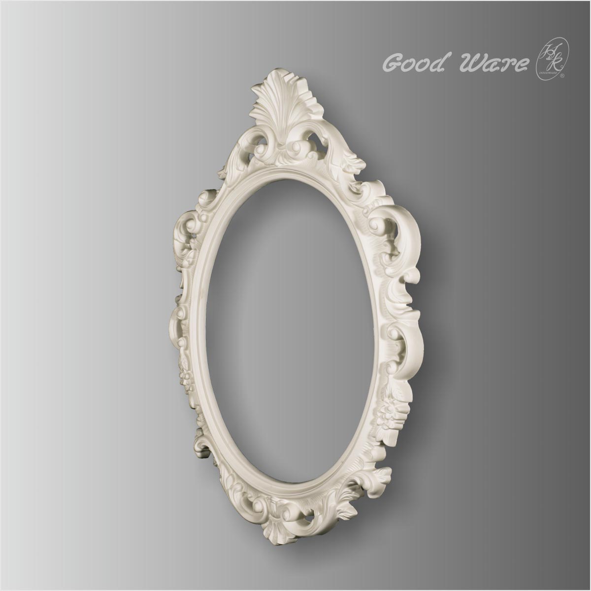 Polyurethane decorative antique mirror frames for sale,  36-5/16”H X 26-3/16”W for outside frame and 23-1/8”H X 19-1/8”W for inside with a depth of 1-15/16”D in size. The antique mirror frames is exquisitely crafted with acanthus leaves and vine motif.  A large oval surface adorns this graceful piece to fill your space with elegant appeal.  It will be fantastic to decorate your dining or living room, entryway or foyer with this enchanting accent mirror frame. Our H&K Goodware mirror frames are open to be customized.