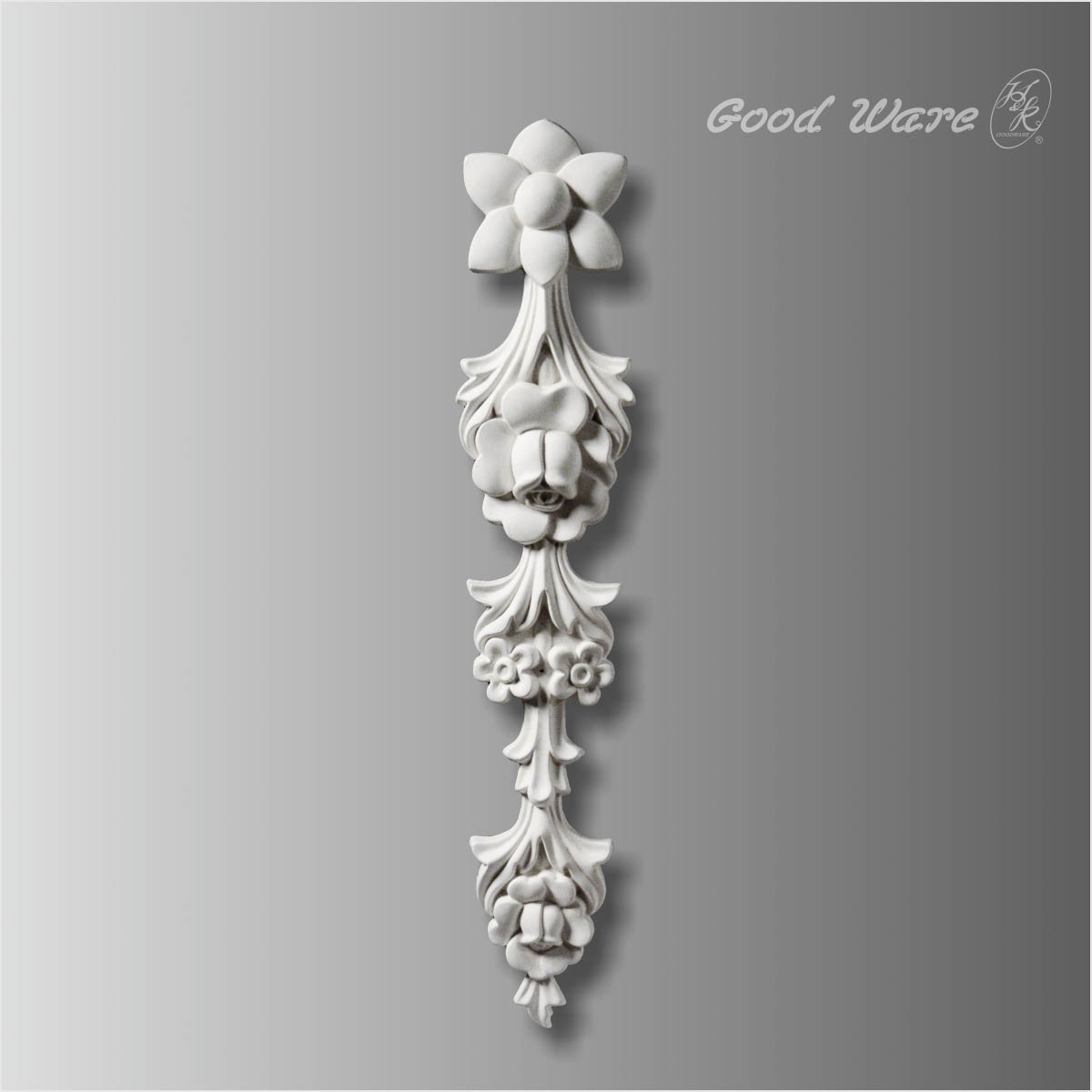 Polyurethane decorative appliques and onlays, 19-9/16”H X 3-15/16”W X 1-3/8”D in size. Coherent and elegant flowers are crafted in painstaking details. This long applique starts with a plain flower to gorgeous and intricate flowers. Decorative and aesthetic like this applique, it can be well applied to walls, ceiling, or windows decoration. Our H&K Goodware appliques and onlays products are open to be customized.