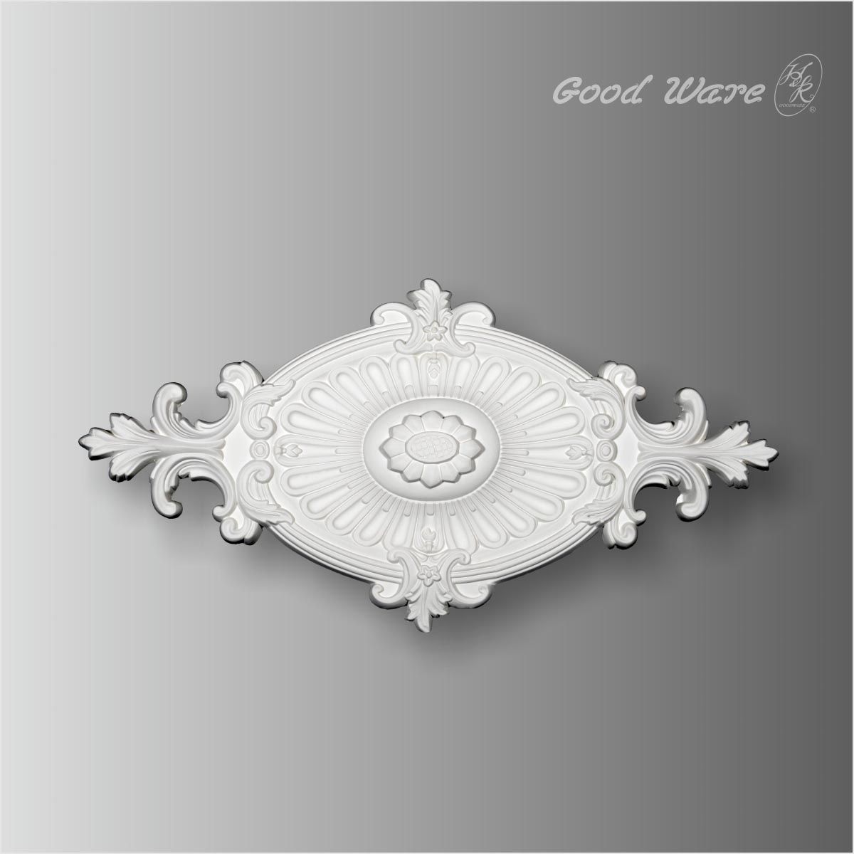 Polyurethane decorative ceiling rose, 23-5/8”H X 12-3/16”W in size.This small scale ceiling medallion comes with a oval shape with four corners decorated with dimensional and elegantly carved flowers and within the oval is crafted with a complete sunflower. This ceiling medallion comes factory primed and ready to faux finished according to your personal preference.Our H&K Goodware ceiling medallion are open to be customized.