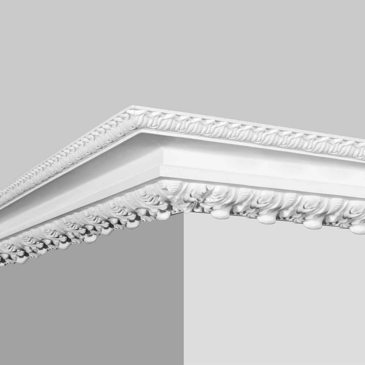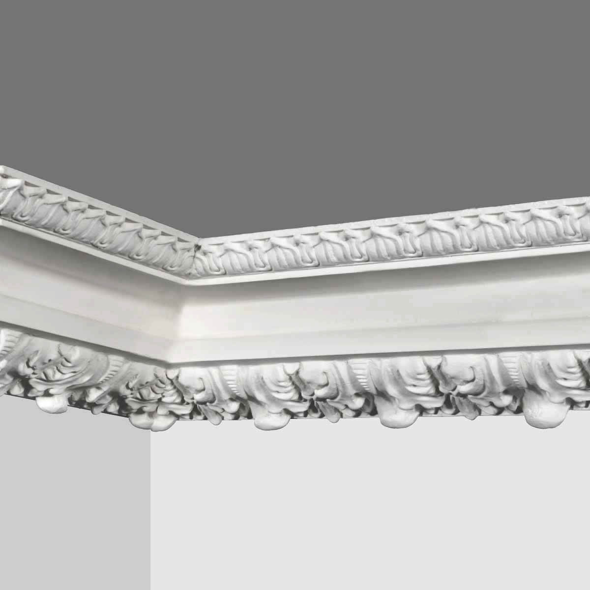 Polyurethane decorative crown molding trim, steep cove as main panel attached no element and crafts detailed and flourishing florals, extreme exquisite figure on separated side making it extremely ornamental. This series of Goodware molding refers to special patterns and specification,subjection to customization is attached.