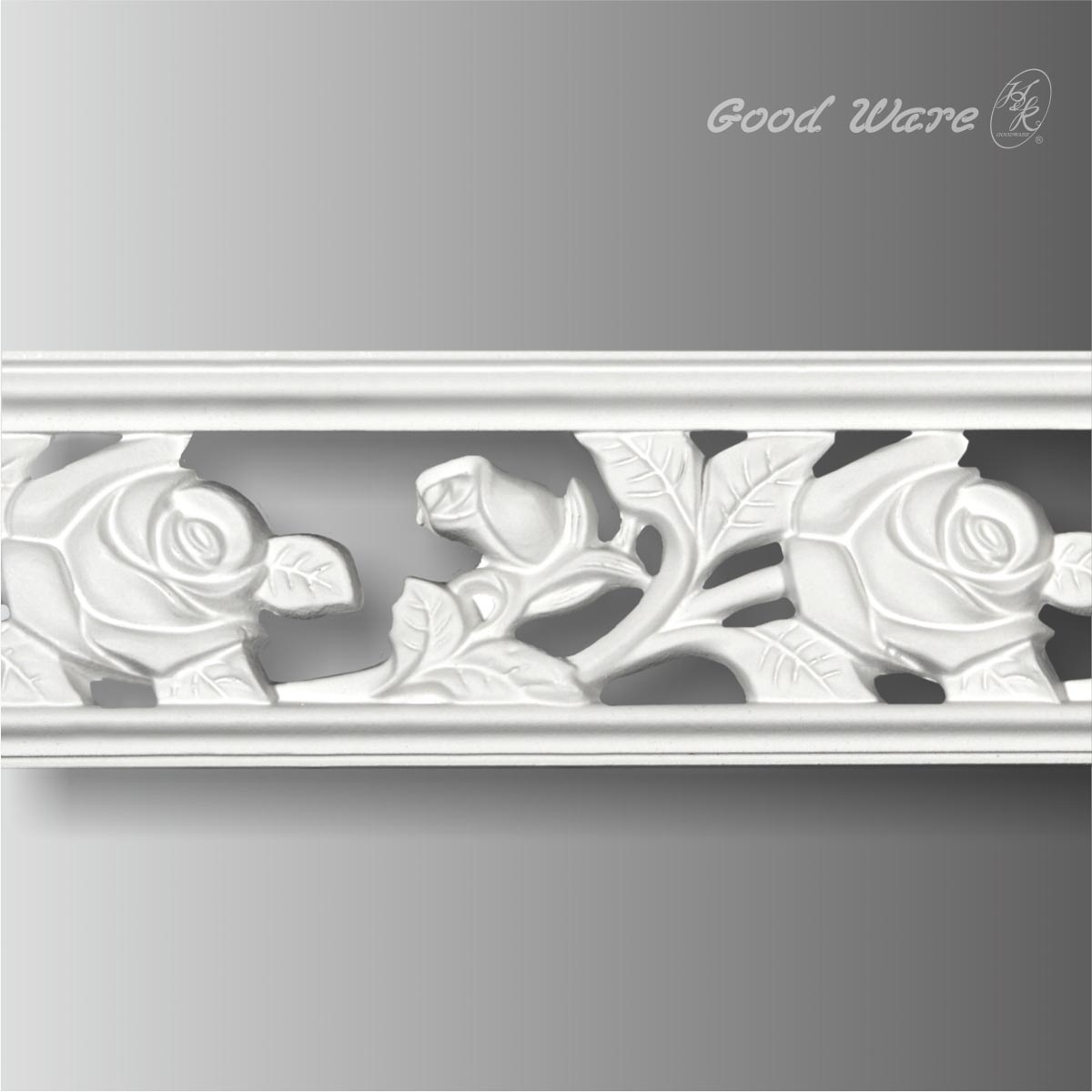 Polyurethane decorative interior moulding and trim, 2-3/4”H X 1/4”W X 78-3/4”L with a Flower of 4-13/16”. This small scale pierced molding takes the impression of rail decorated with gorgeously crafted roses. The pierced molding is pervious to light, therefore,ideal to ceiling and wall decoration. All our Goodware moldings are pre-primed and customized.