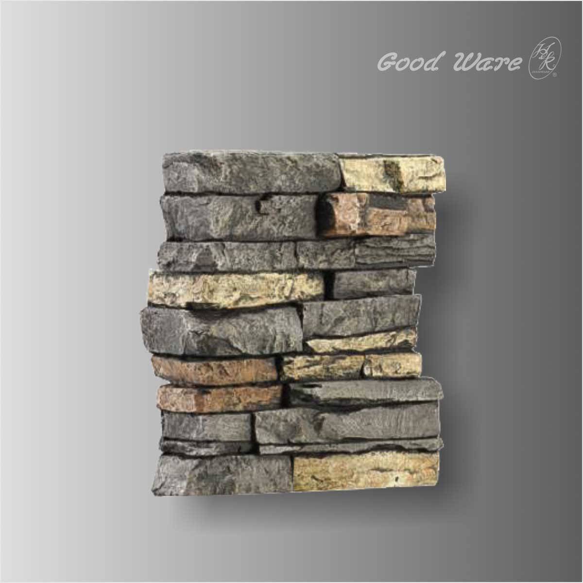 Polyurethane faux stone panels for living room, 11-13/16”H X 10-5/8”L X 2-9/16”W with depth ranging from 13/16”~1-15/16” in size. These faux stone panels can be easily installed at home with no formal training. This section can be combined wtih GH-669 to embrace the angle of walls. These faux stone bricks can connect together seamlessly with our intricate interlocking knots design. There is no need to pay for additional materials, equipment or labor to install the panels due to the lightweight feature.Our H&K Goodware faux stone panels are open to be customized.
