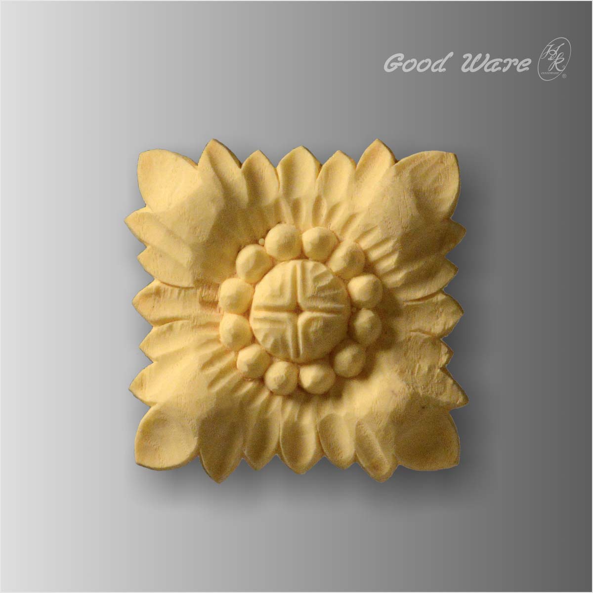 Polyurethane faux wood carved rosettes, 3-3/8”H X 3-3/8”W X 9/16”D in size. This flourishing artificial wood takes the actual impression of wood in both grain and touch sphere. It is crafted by our professional artisan with hand and the intricate details of the exquisite flowers are well conveyed. This imitation wood can be applied to windows, wardrobes, chair rail and ceilings decoration. Our H&K Goodware imitation wood products are open to be customized.