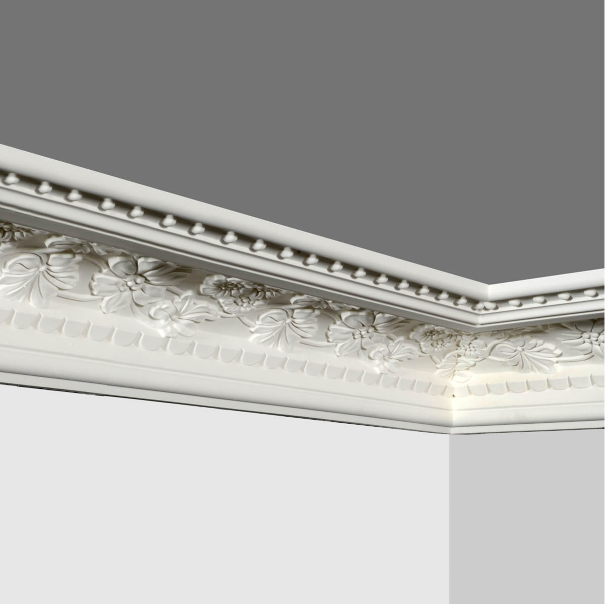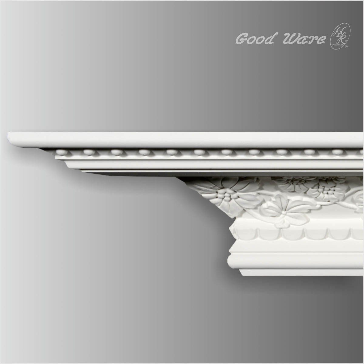 Polyurethane floral crown trim molding, scatters a cove of graceful and exquisite detailed flowers creating a exuberant scene. This series of Goodware molding refers to special patterns and specification, subjection to customization is attached.