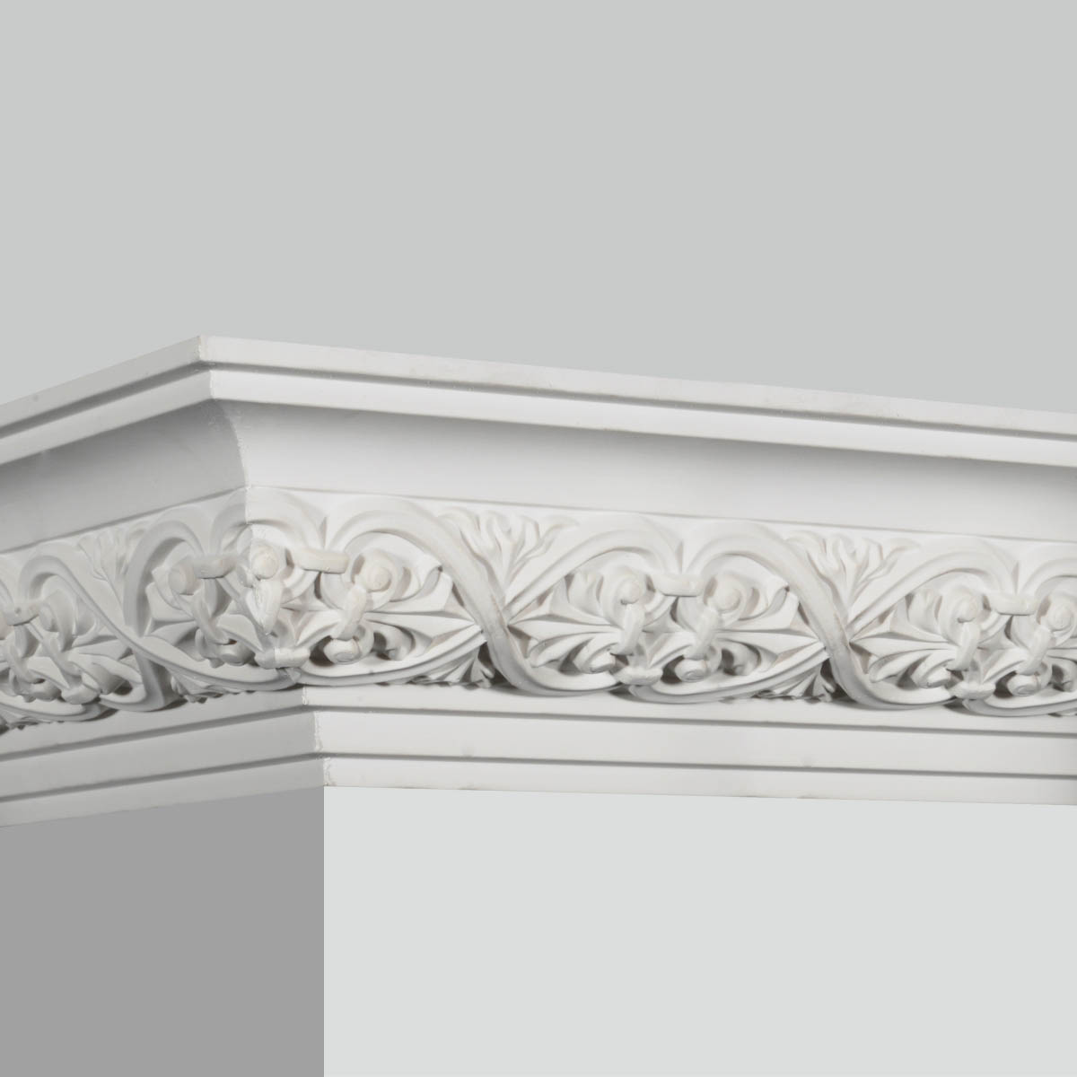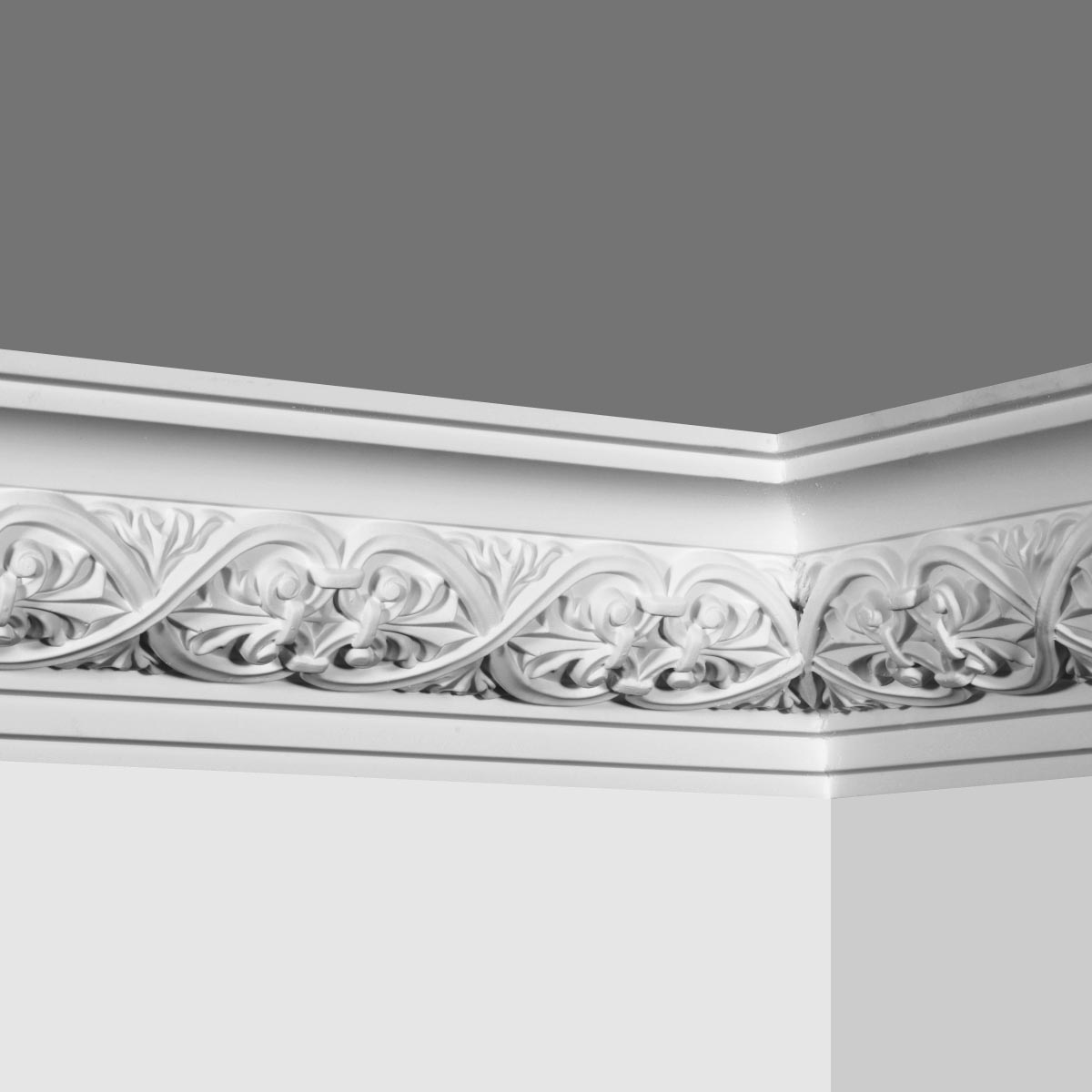 Polyurethane gothic crown molding is 4-1/16”H X 4-5/16”W X 94-1/2”L in size with a breadth 6”and flower:6”. This polyurethane gothic crown molding crafts graceful and elegant grape-vines in deep details and exquisite craftsmanship with shadows castes on making this molding decorative and dimensional. Our Goodware moldings are all open to customization.