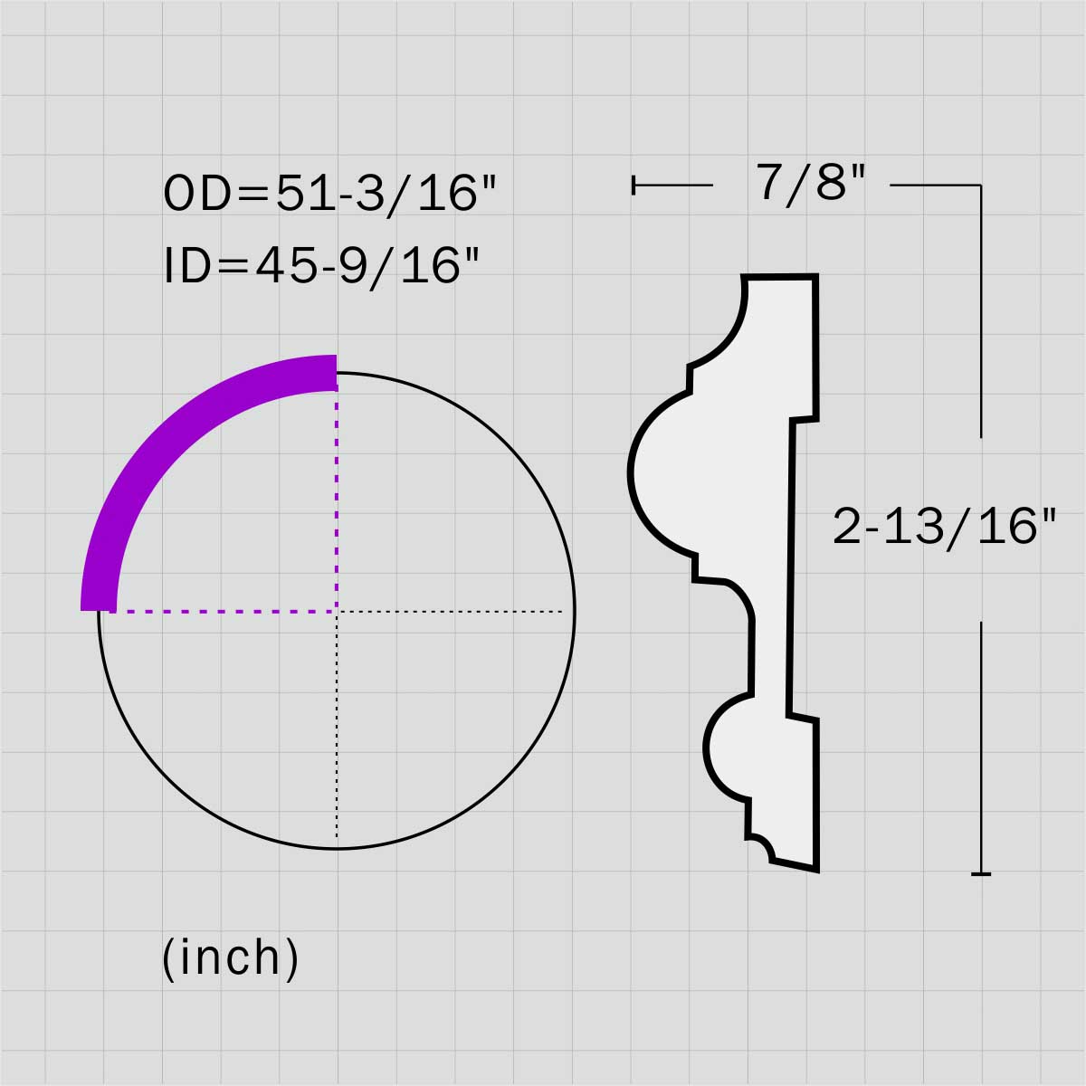 Polyurethane medallion ring for dining room decor, 2-13/16”H X 7/8”W in size with an 51-3/16” OD and 45-9/16” ID. This larger ceiling arc frame demonstrates the classic design applied with carving molding creating rich sense of depth and dimension. The ceiling rail can decorate the ceiling alone or can group to a whole frame to support the dome. All our Goodware moldings are pre-primed and customized.