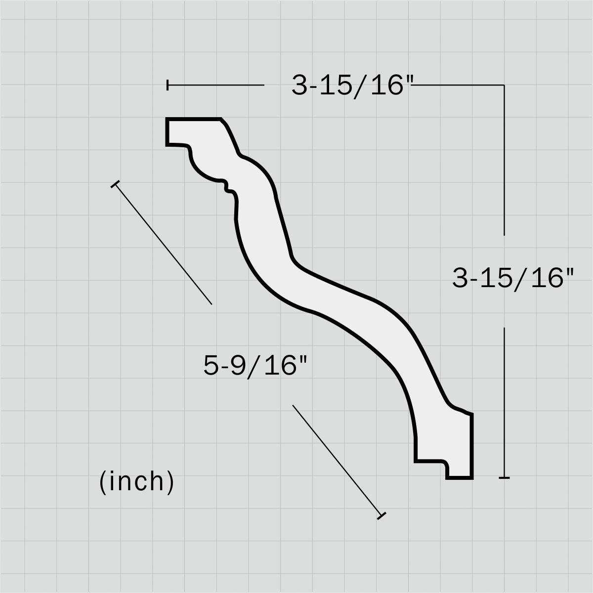 Polyurethane modern 4 inch crown molding cabinets, 3-15/16”H X 3-15/16”W X 94-1/2”L in size and with a breadth of 5-9/16”. The medium profile molding adopts the typical plain molding design scheme of multiple layers with a waving cove making this molding plain but decorative. All our Goodware moldings are pre-primed and customized.