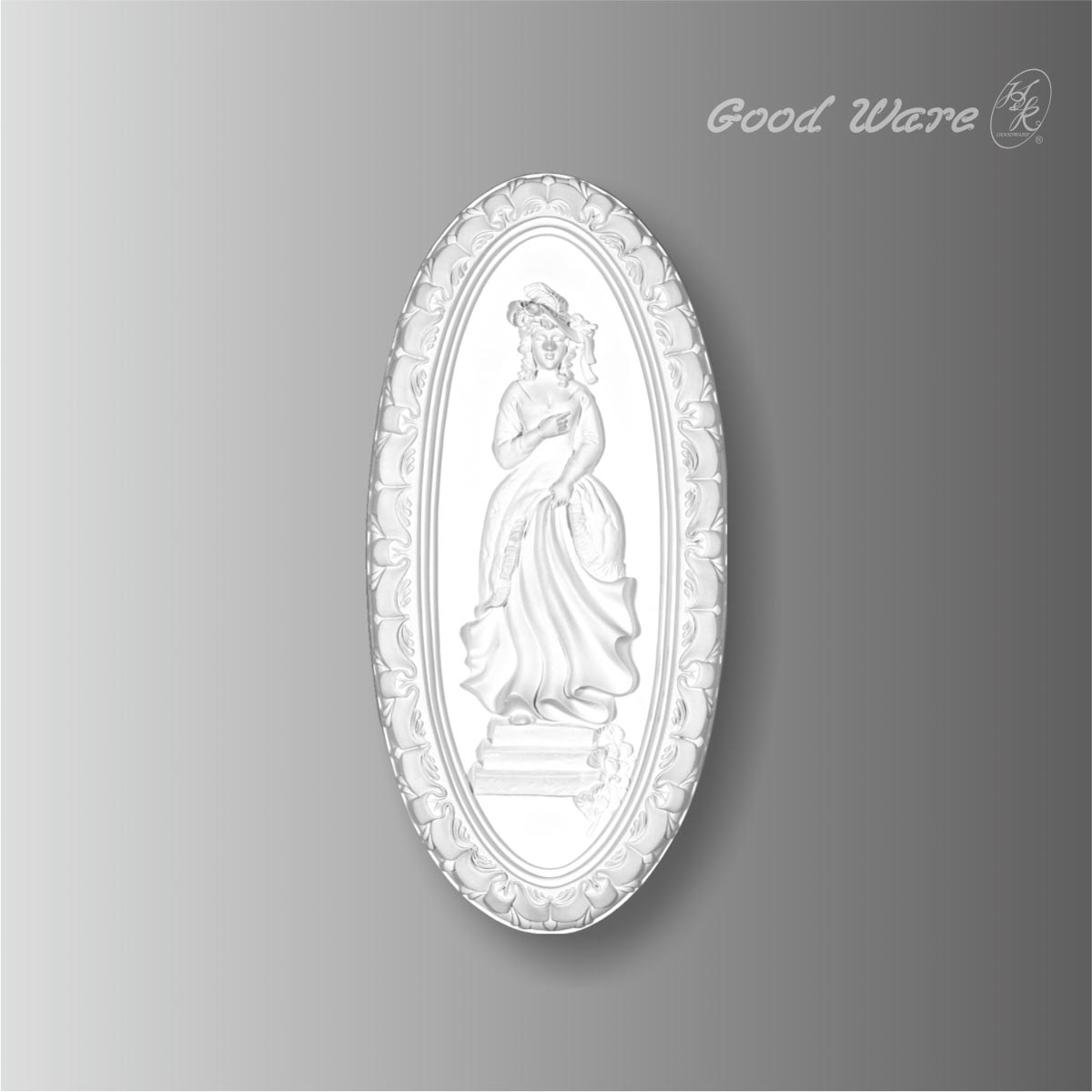 Polyurethane oblong engraved wall plaques, 16-1/8”H X 7-3/4”W X 13/16”D in size. This oval architectural wall decoration applique crafts a graceful lady with delicate and exquisite expression. The flowers decorated crisp line enriches the mirror frame applique in great details. The round applique can be attached to walls, ceilings or frames to improve the ambiance. Our H&K Goodware wall decorations are open to be customized.