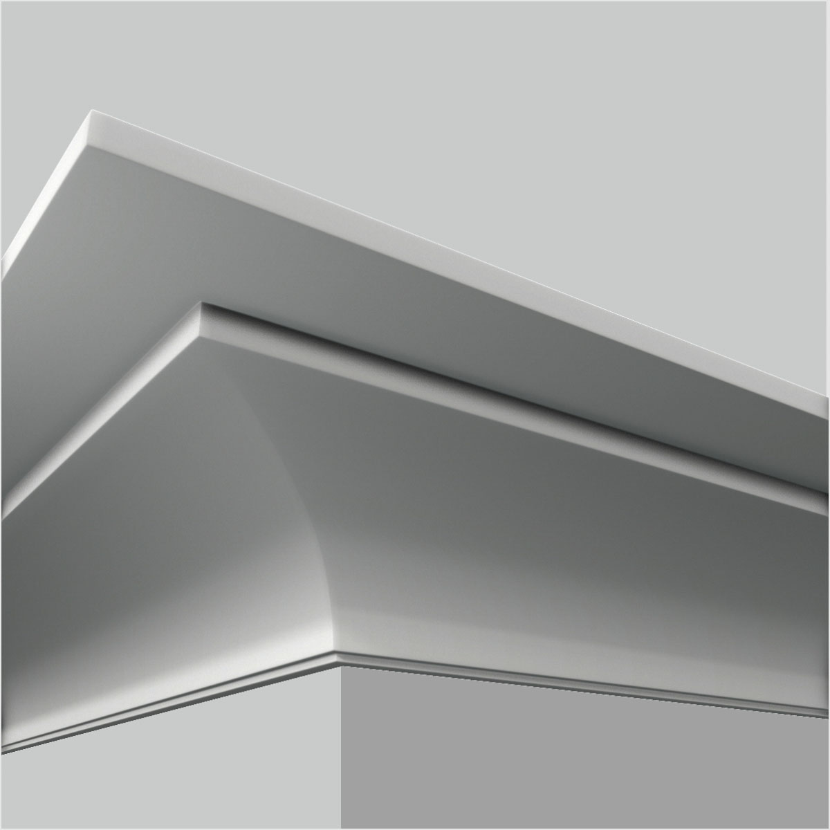 Polyurethane outdoor crown molding, 3-13/16”H X 7-13/16”W X 94-1/2”L in size and with a breadth of 8-11/16”. This plain designed molding goes to our medium large scale molding line involving a sinking cove with clean smooth surface. All our Goodware moldings are pre-primed and customized.