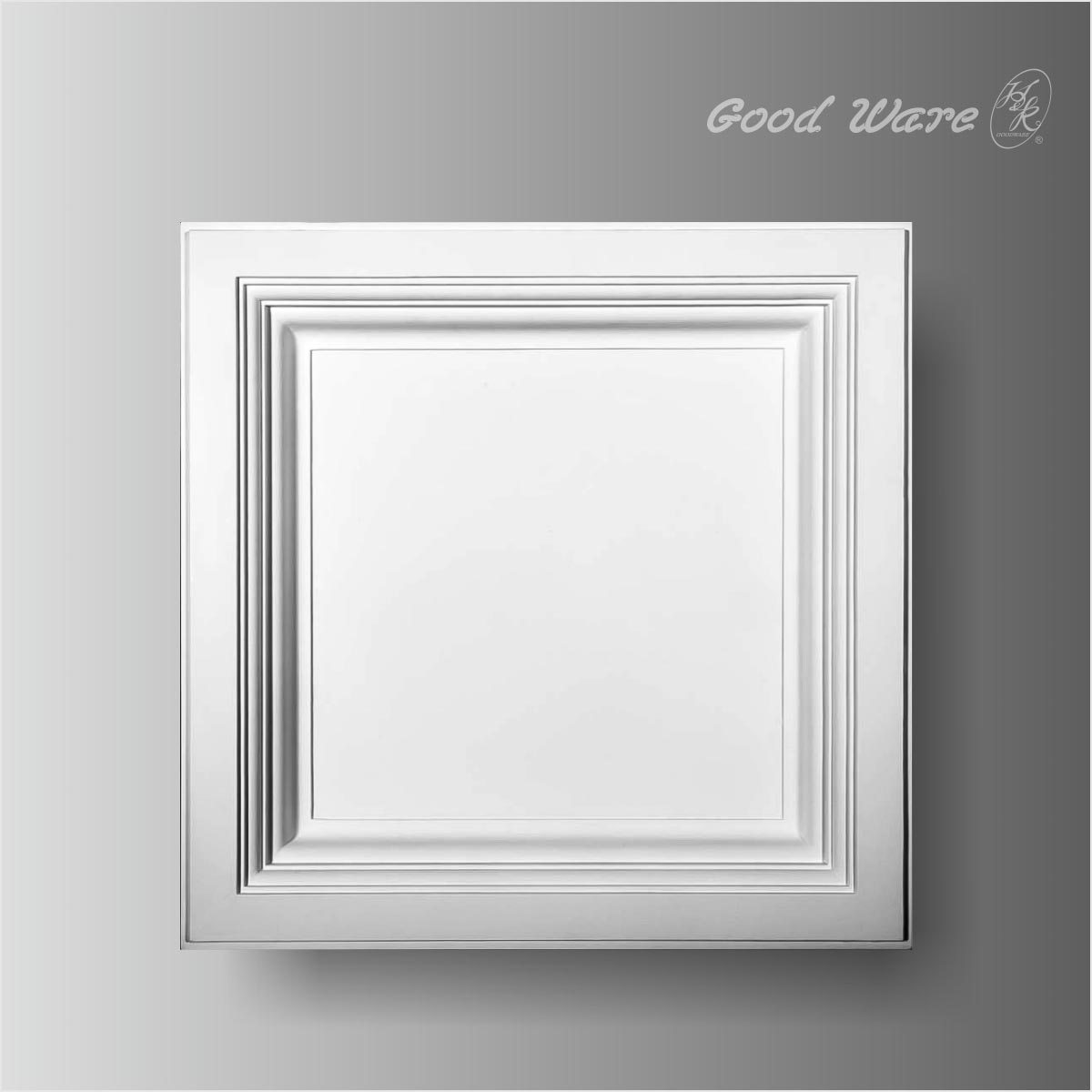 Polyurethane plain white ceiling tiles, 23-13/16”H X 23-13/16”W X 2-9/16”D in size. This ceiling tiles adopts standard size for ceiling decoration making it highly versatile. This tile comes with plain surface with deep cove combined with multiple steps creating sense of dimension. With specific demands, the central can be carved to hole serving for audio, light or sprayer. Our H&K Goodware ceiling tiles are open to be customized.