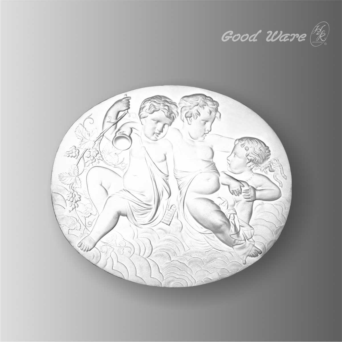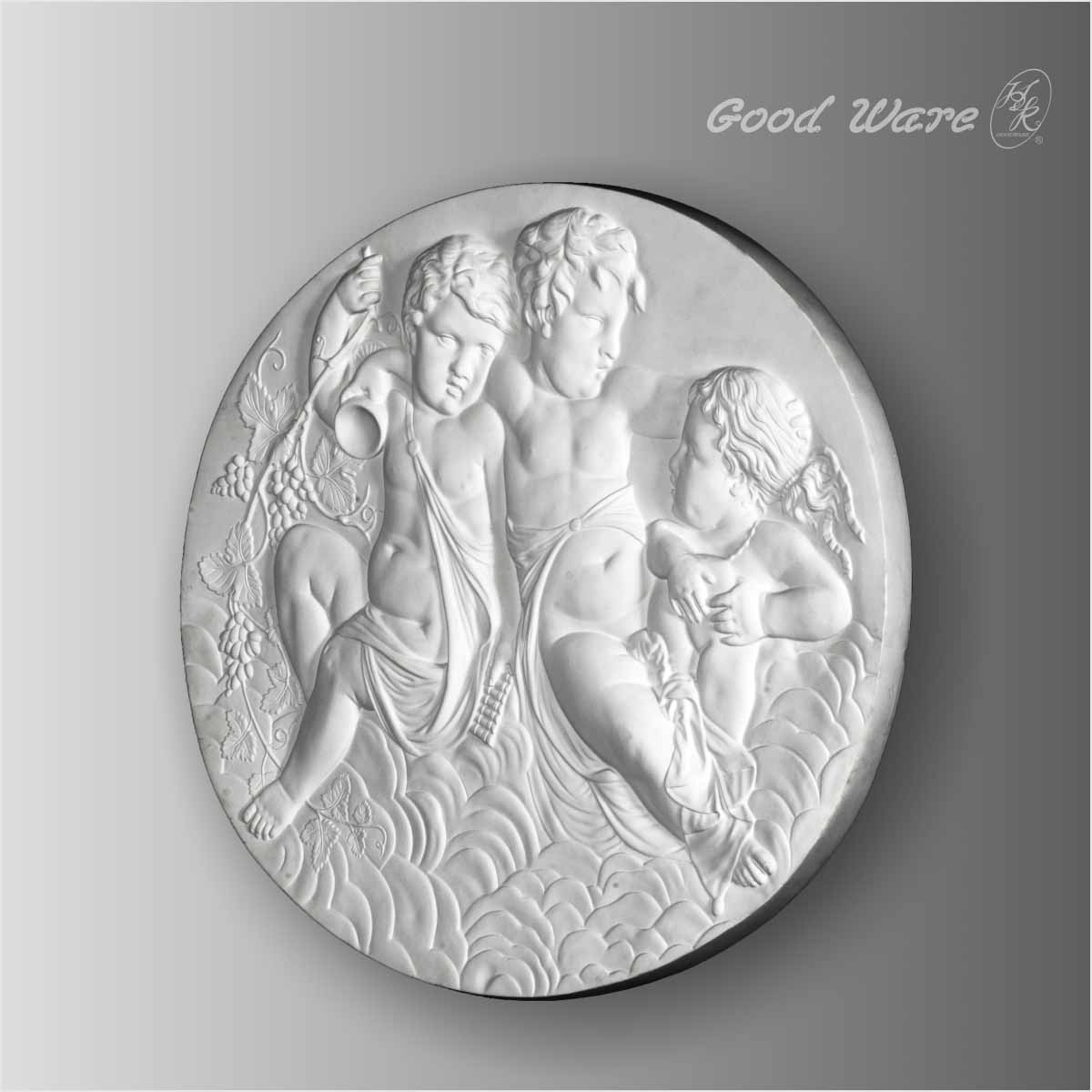 Polyurethane round wall plaques for sale, 26-9/16”H X 22-7/16”W X 1-7/16”D in size. This large scale architectural wall decoration applique is crafted with smooth and clean surface decorated with vigorous boys floating on the vivid clouds. The round applique can be attached to walls, ceilings or frames to improve the appearance. Our H&K Goodware wall decorations are open to be customized.