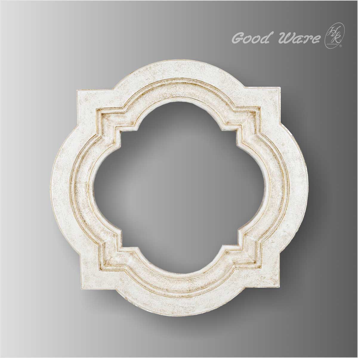 Polyurethane white mirror frame for sale, 29-1/2”H X 29-1/2”W for outside frame and 19-7/8”H X 19-7/8”W for inside with a depth of 1-15/16”D in size. This complicated decorative wall mirror frame features an intricately carved frame combined with two shapes. The flourishes that climb and curl around the geometric arched mirror frame make this a stunning accent that will make your home look great. Hang it in the entry or hall, above the bathroom sink, or in your bedroom. Our H&K Goodware mirror frames are open to be customized.