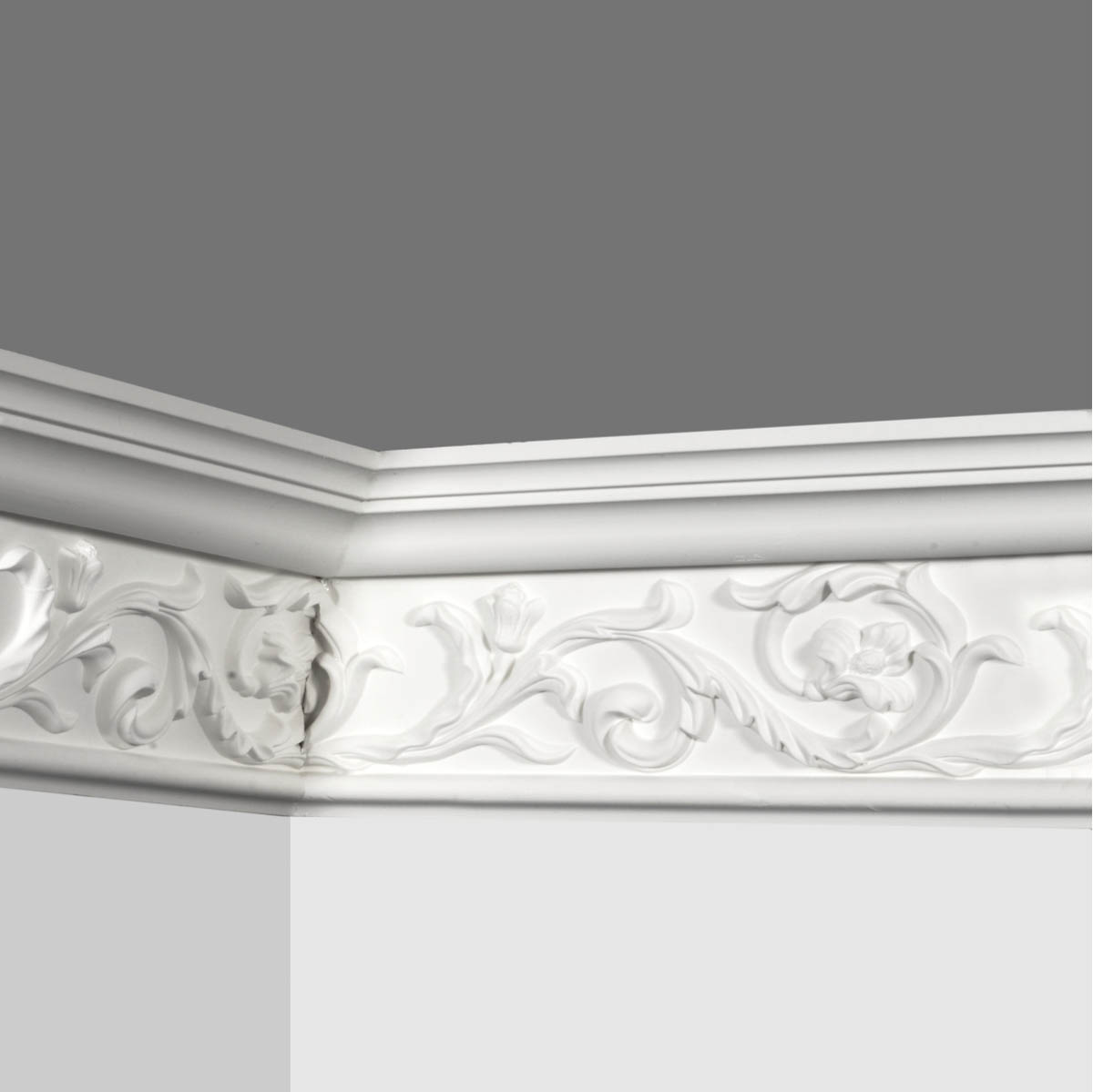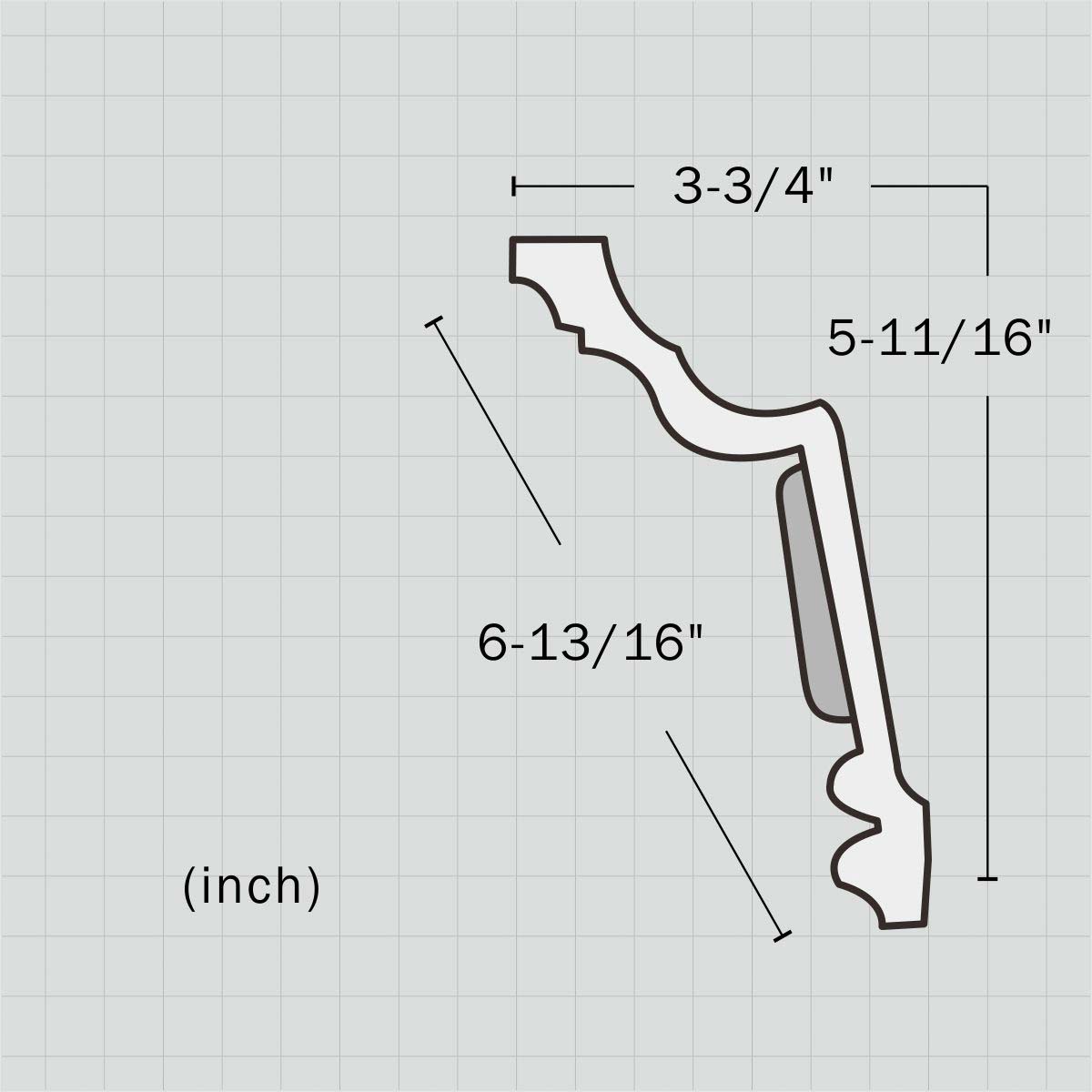 PU decorative scroll crown molding is 5-11/16”H X 3-3/4”W X 94-1/2”L in size with a breadth 6-13/16”and flower:9-7/16”. This PU decorative scroll crown molding goes with a design of which a multiple layers connected cove filled with intertwined flourishing flowers illustrating strong sense of layers and depth. Our Goodware moldings are all open to customization.