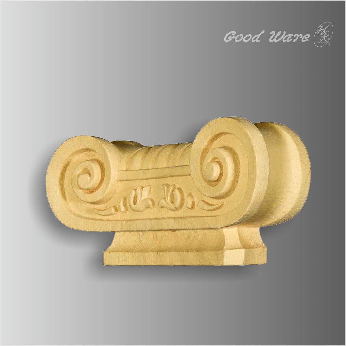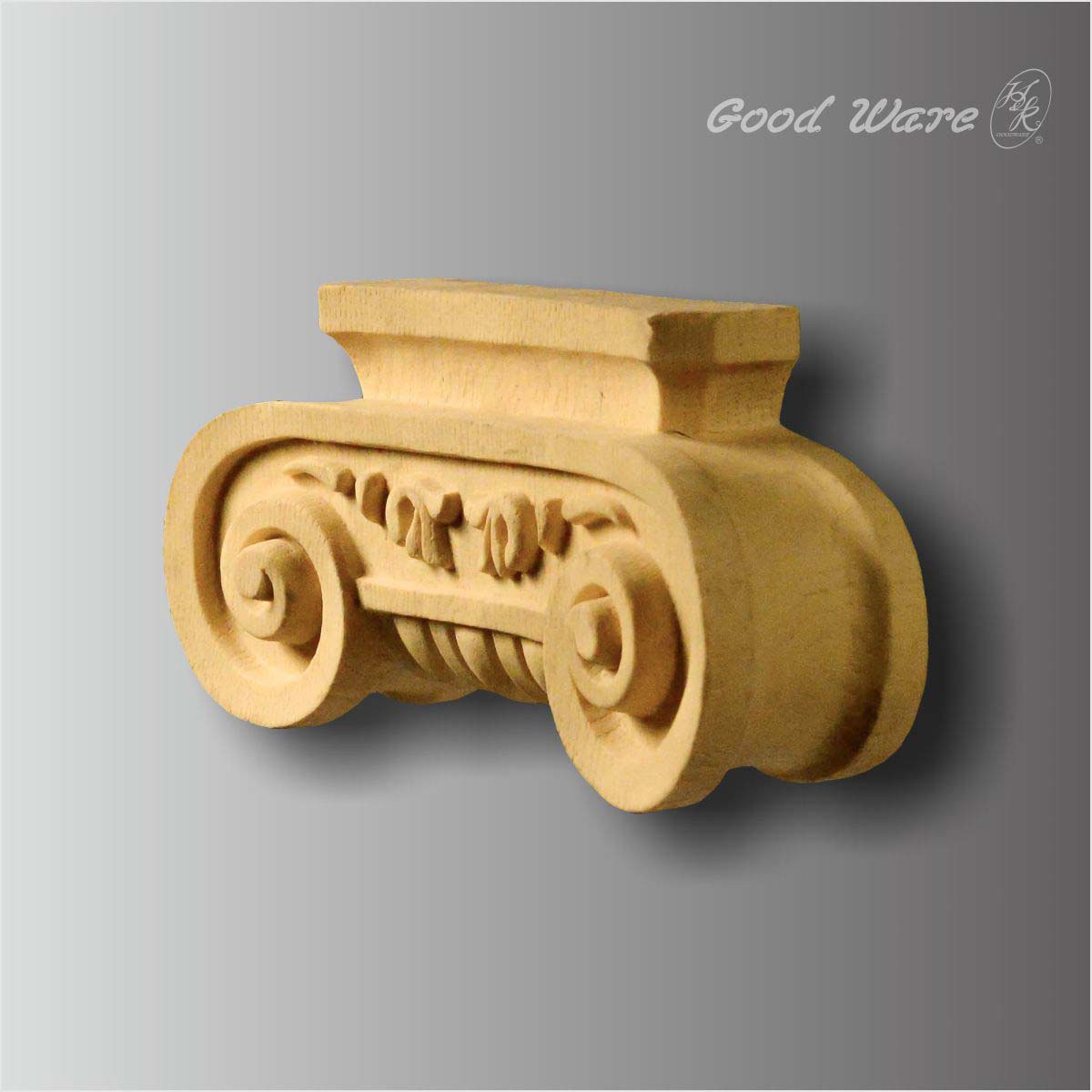 PU faux wood ionic decorative corbel shelves, 9-15/16”H X 4-3/4”W X 2-9/16”D in size. This imitation wood corbel mimics the actual impression of wood in both grain and touch sphere. This artificial wood corbel takes the impression of ancient vehicle with intricated crafted scrolls and florals. This wooden corbel is only part of the commonly applied corbel. It can be applied to entry, cabinets, counter tops, shelves, and other applications. Our H&K Goodware corbels are open to be customized.