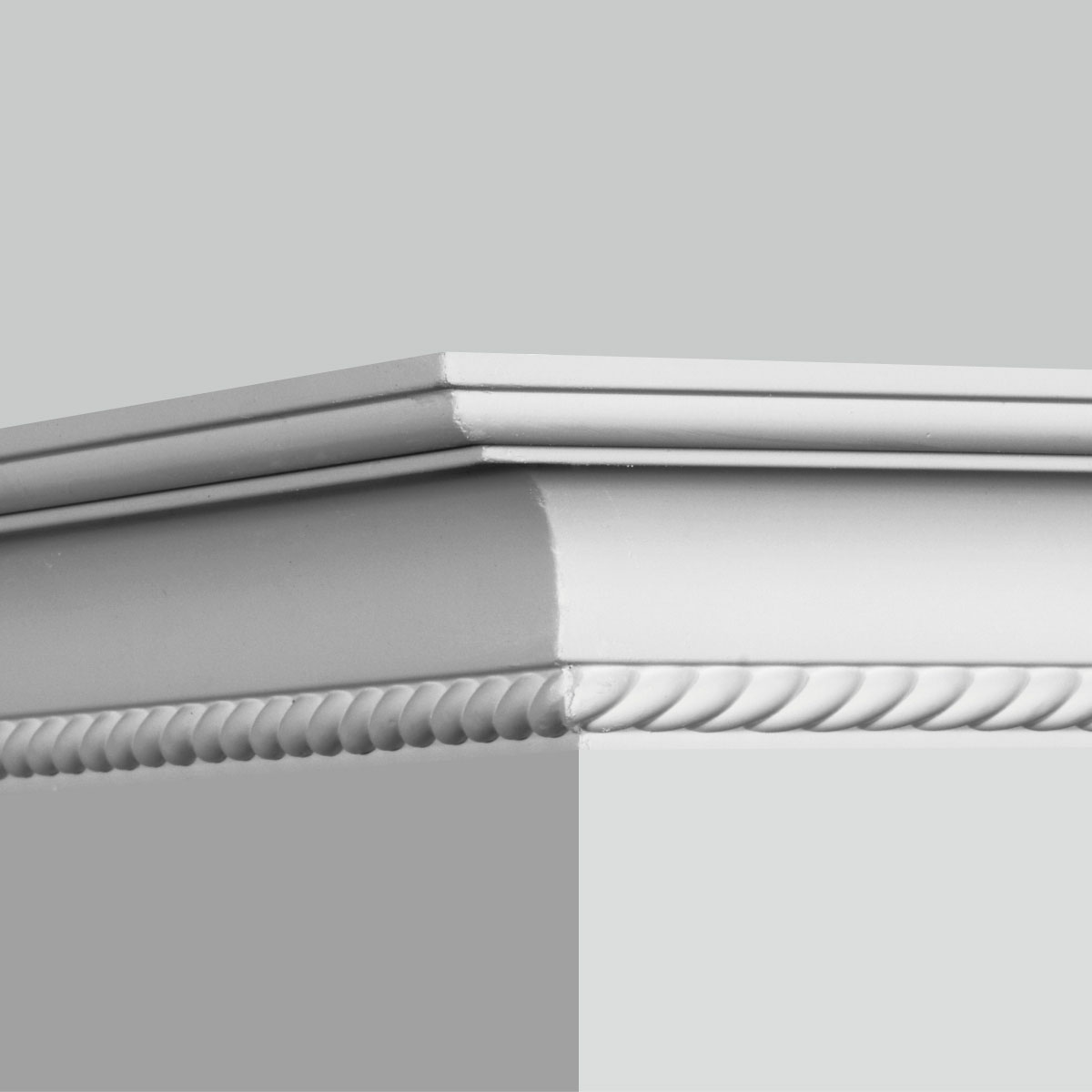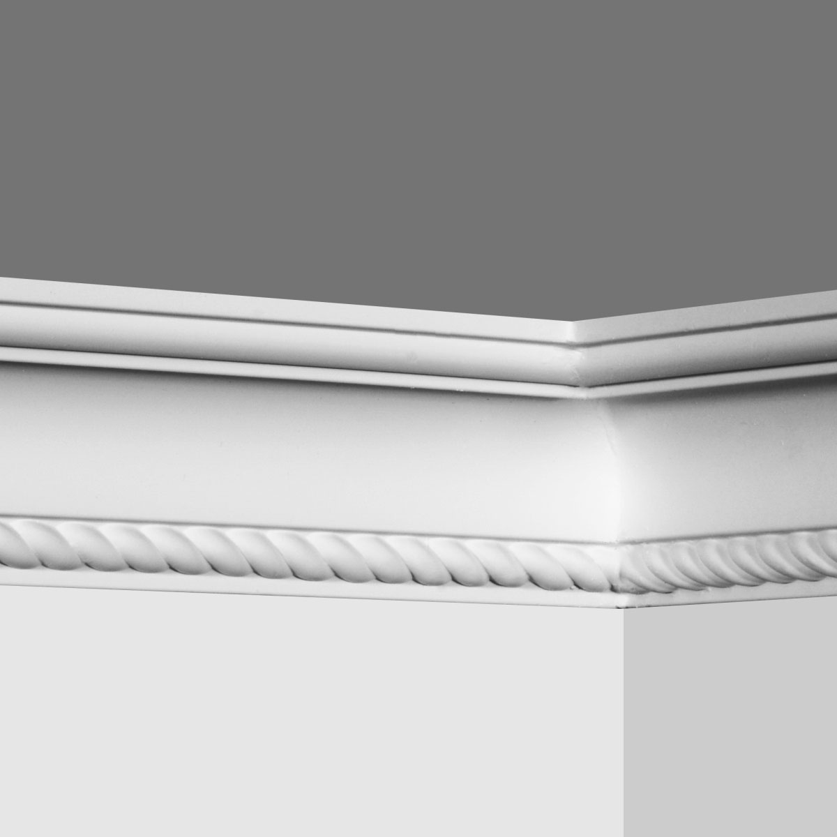 Polyurethane rope interior design crown molding is 2-3/8”H X 2-3/16”W X 94-1/2”L in size with a breadth 3-1/8”and flower:3/8”. This rope interior design crown molding belongs to our small molding line and comes with steep cove combined with ropes at the bottom. Our Goodware moldings are all open to customization.