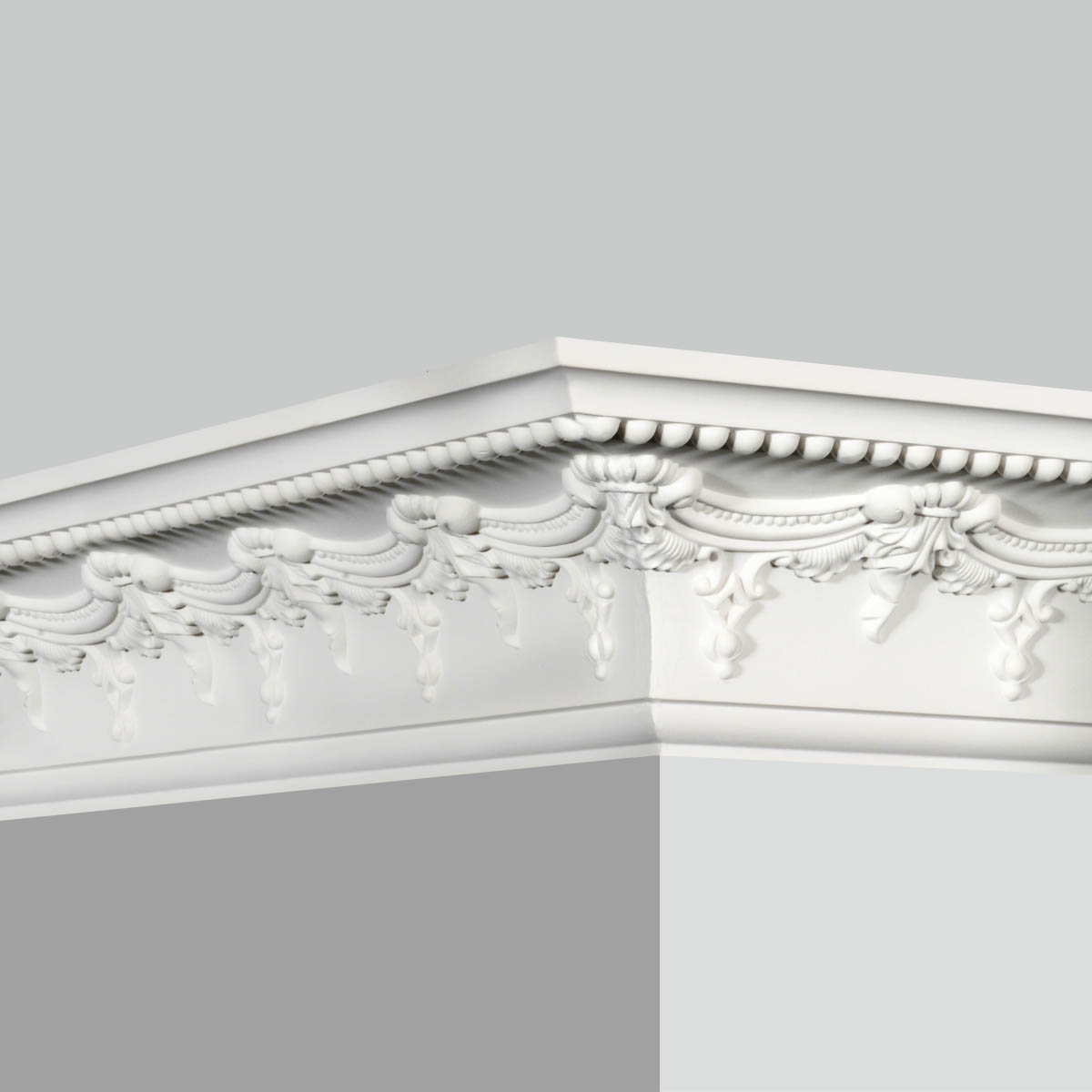 Polyurethane Victorian crown molding with bead designs with cove structure and macrame connected florals. Polyurethane crown molding will spare space utilization rate vertically, making lower ceiling higher in visualization. Victorian crown molding with bead express dense sense of elegance. With our Goodware moldings installed, instant improvement of your space utilization and visualization will be achieved. Polyurethane crown molding with rose welcome customization, factory primed, ready to faux finish or to be stained, painted catering to your preference to fulfill your demands on style and taste of decoration.